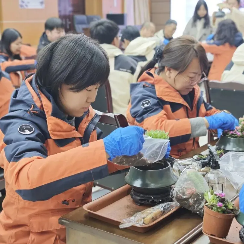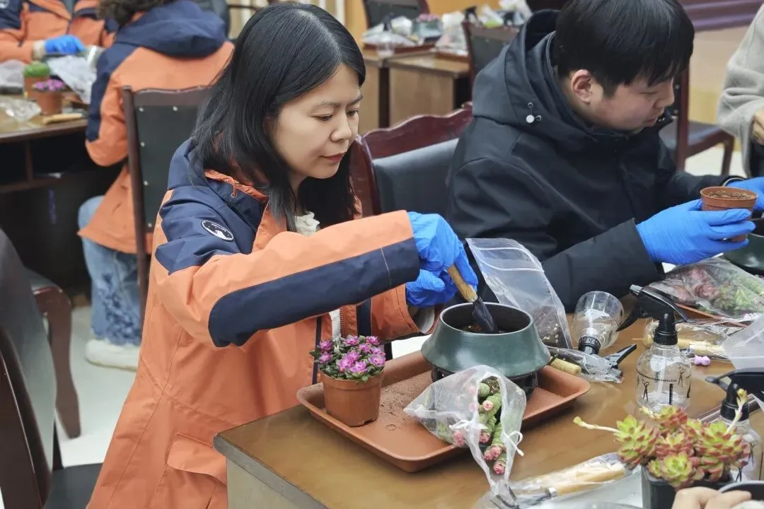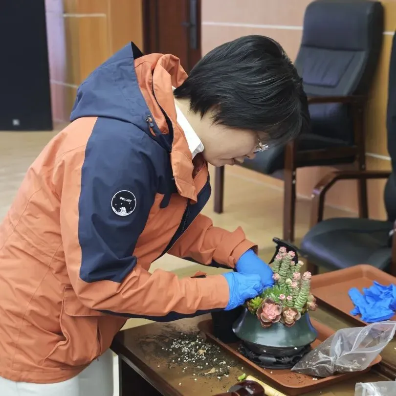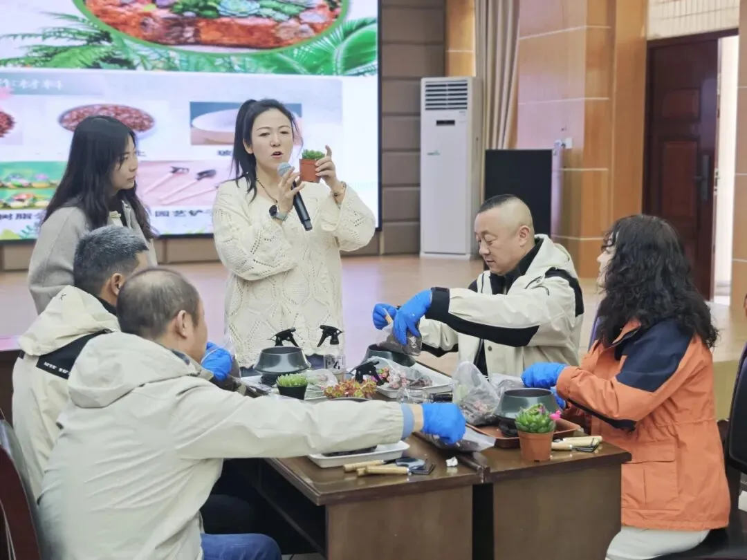 活动现场,专业园艺老师围绕多肉盆栽的日常养护要点,包括光照把控、土壤选择、浇水施肥技巧等进行了深入浅出的讲解。大家认真聆听,不时提问互动,气氛轻松而专注。随后,在老师的指导下,大家纷纷动手体验园艺创作的乐趣,填土、栽苗、搭配绿植造型,每个人都化身巧手花匠,用心打造出独一无二的盆栽作品。过程中,大家互相交流心得,分享养护经验,欢声笑语此起彼伏,现场洋溢着热烈又温馨的氛围。