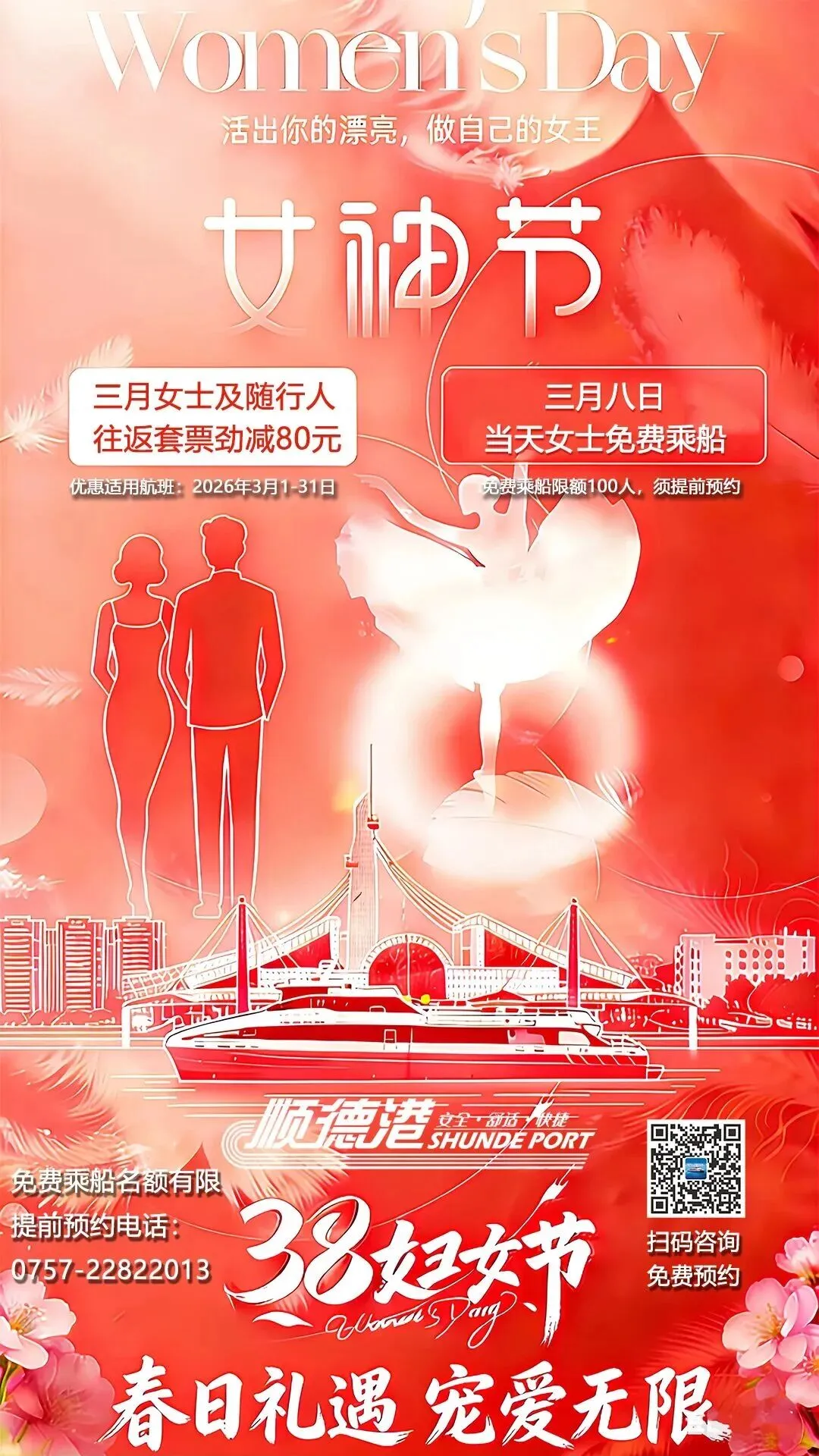 符合免费乘船条件的女士旅客,请于微信公众号“顺港客运”私信或致电0757-22822009提前预约,免费乘船限额100人,须提前预约,约满即止。