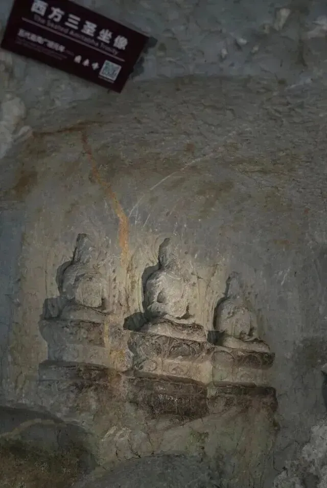 走出青林洞,还有一龛吴越国的西方三圣像(2号)高踞于山顶,其位于青林洞西侧的悬崖边上,因位置隐秘且是常人难以接近的高度,其幸运地躲过了多次劫难,至今为止除了轻微的破损,总体保存完好,不过也因此难以被游客发现,少有人驻足于此。