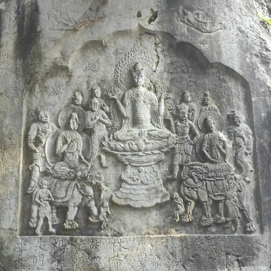青林洞南入口右侧有一龛北宋时期的作品——“卢舍那佛会”浮雕,雕凿于北宋乾兴元年(1022年),是由一位名叫“胡承德”的当地人为祈求家人平安而出资镌刻的。浮雕面积不大,仅高146厘米,宽150厘米,但却在有限的岩壁上营造出一个层次分明、主次分明并充满动感的佛国盛会场景。据说其不仅是飞来峰宋代造像的题记最清晰、艺术水准最高的代表作之一,更被研究者誉为“中国石窟艺术的最后辉煌”中一抹独特的文人笔意。观看时,需要稍微退后几步才能看清全貌,光线从洞口射入,照在浮雕上,明暗对比,浮雕跃然壁上,仿佛感应到一千年前那位名为“胡承德”的祈福人同样的心情。