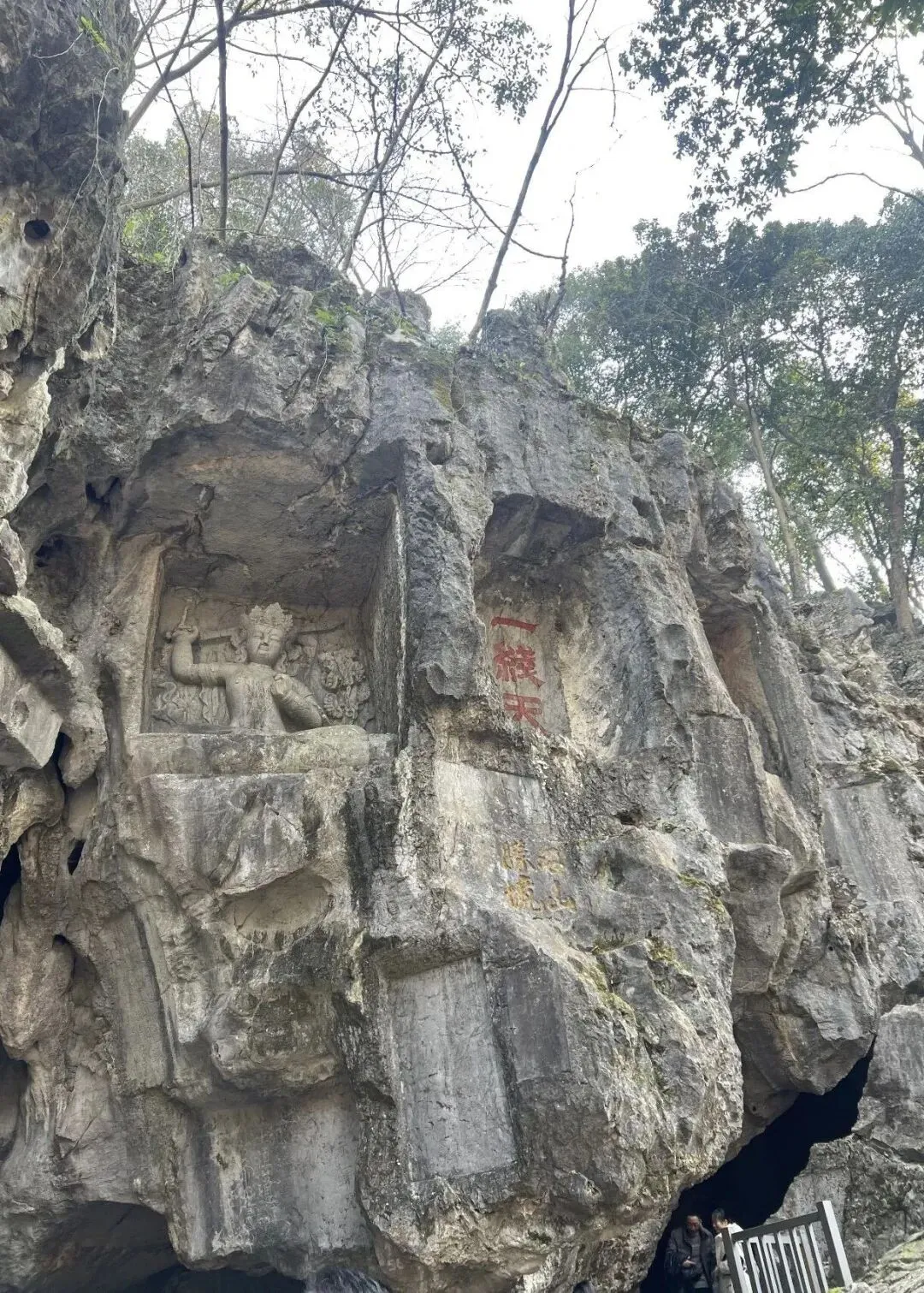 再往前走,同是冷泉溪南侧的悬崖上有一龛尊胜佛母像,雕凿于元至元二十四年(1287年),是飞来峰规模最大、雕刻最精的元代“樊式”造像,是元代汉藏艺术交融的杰出代表。
