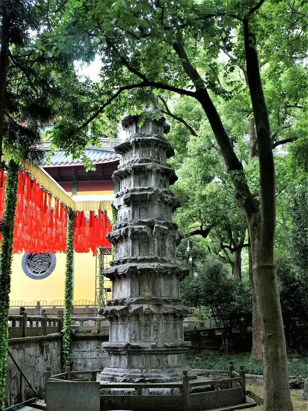 大雄宝殿前露台东西两侧各有一座石塔,为钱弘俶重修灵隐寺时所立,为八面九层仿木构楼阁式,塔身雕刻上百座佛像,十分精致。