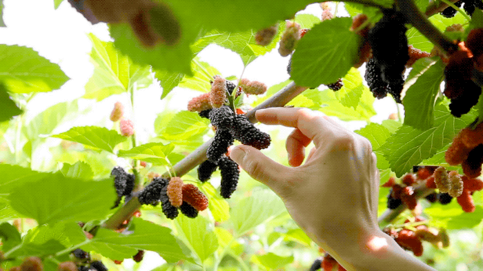 游客采摘桑果时,应采摘成熟的桑果(避免浪费),禁止采摘桑叶、桑芽(若需购买请联系工作人员),爱护果树,切勿摇晃果树。谢谢~