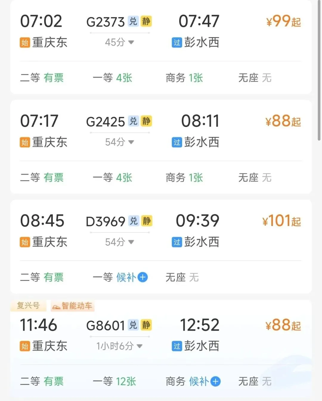 🚅出行选择>>乘坐高铁可直达彭水,重庆西、重庆北、重庆东均有直达车,首选重庆东站,最快45分钟即可抵达。