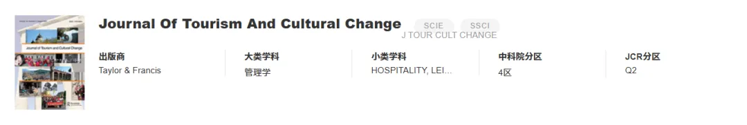 《Journal of Tourism and Cultural Change》 影响因子 2.2 分区 中科院4区 JCR2区 发文量 22 推荐理由 聚焦文旅融合路径、遗产保护与旅游平衡、文化体验创新,录用率 70%+,对质性研究友好