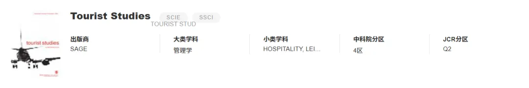 《Tourist Studies》 影响因子 3.3 分区 中科院4区 JCR2区 发文量 18 推荐理由 适配微观层面实证研究,录用率 60%+,对细分方向深度研究友好