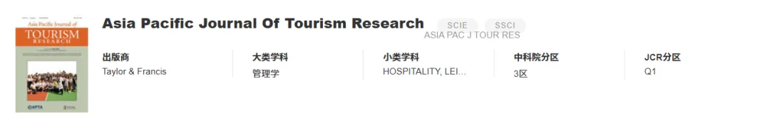 《Asia Pacific Journal of Tourism Research》 影响因子 4.3 分区 中科院3区 JCR1区 发文量 82 推荐理由 专注文化遗产旅游开发、智慧旅游场景搭建、休闲体验创新等,录用率 65%+,初审 7 天,审稿 1-2 个月,非 OA 无版面