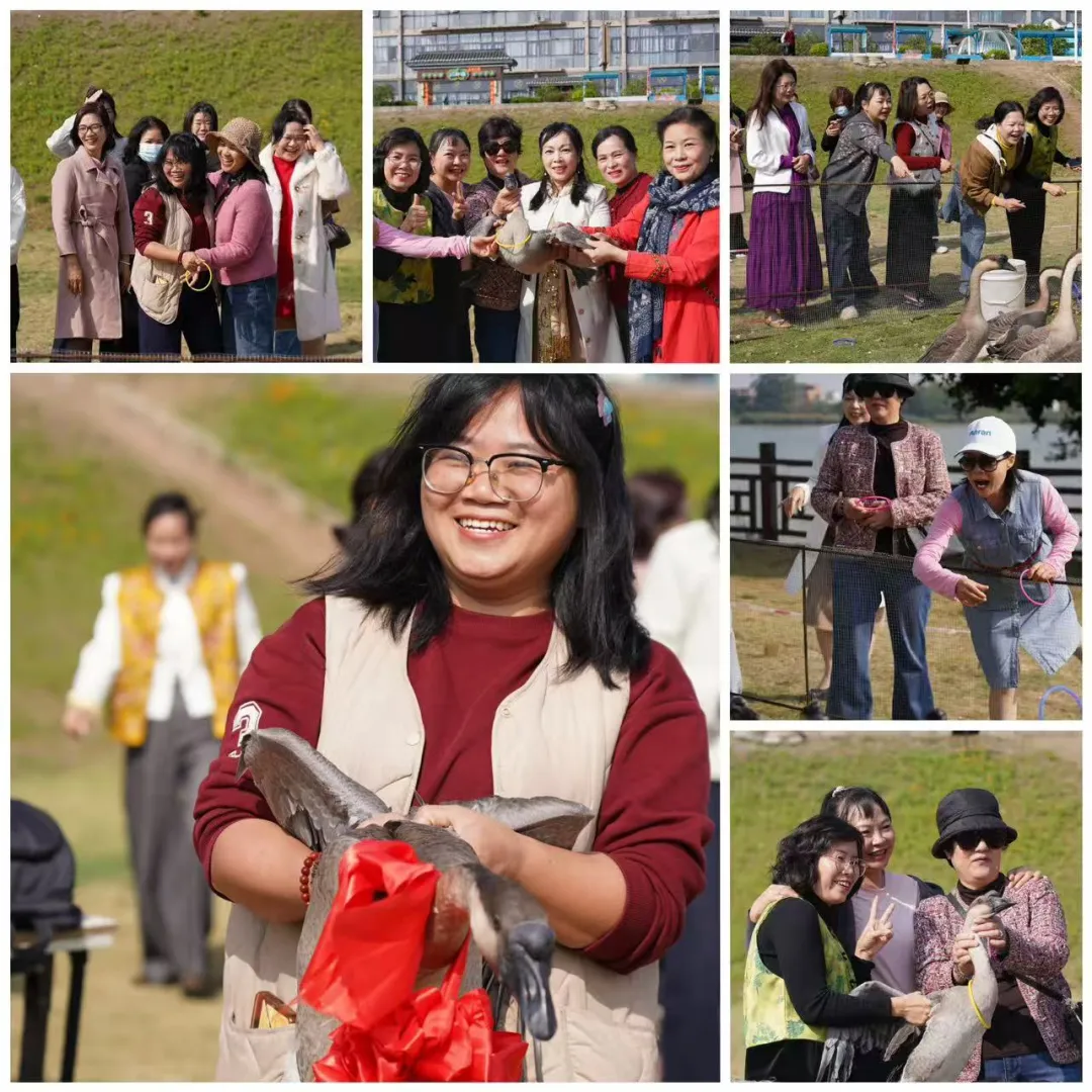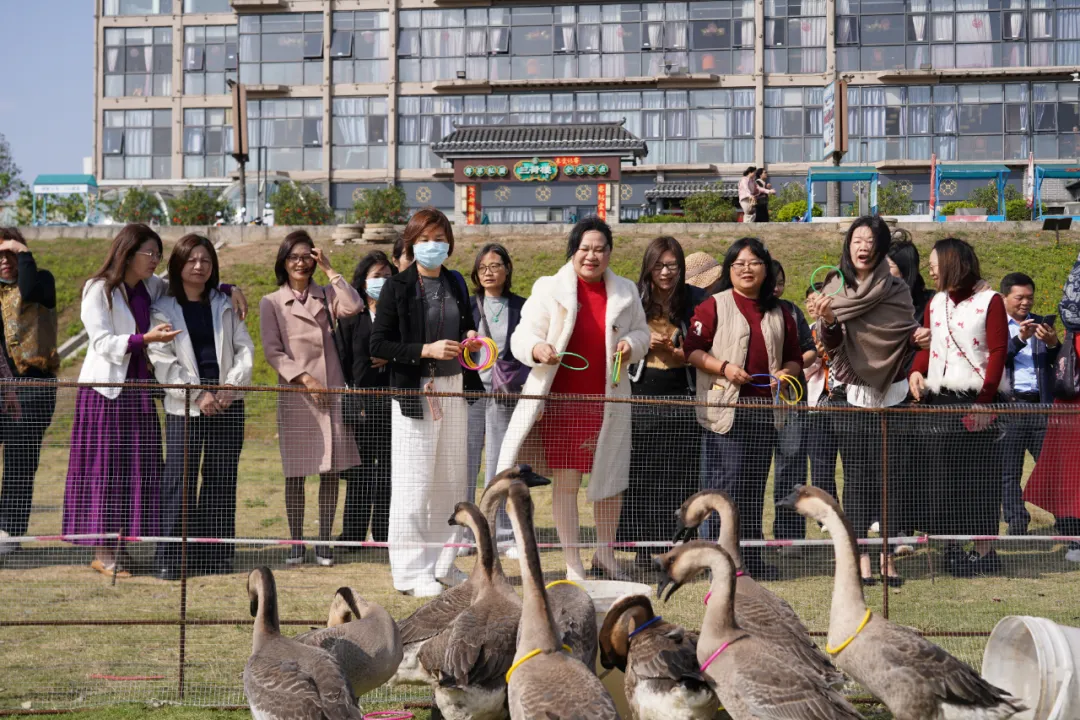 活动伊始,女神们首先来到三荷楼后方的日出码头,参与趣味盎然的“开心套大鹅”活动。姐妹们个个摩拳擦掌,目光紧锁目标,彩圈在空中划出一道道优美的弧线。“中了!中了!”随着一位姐妹手气爆棚,一举套中一只三洲黑鹅,现场气氛瞬间沸腾,欢呼喝彩声此起彼伏,大家纷纷上前合影留念,分享这份难得的好运与喜悦,开场便定格了满满的活力与温情。