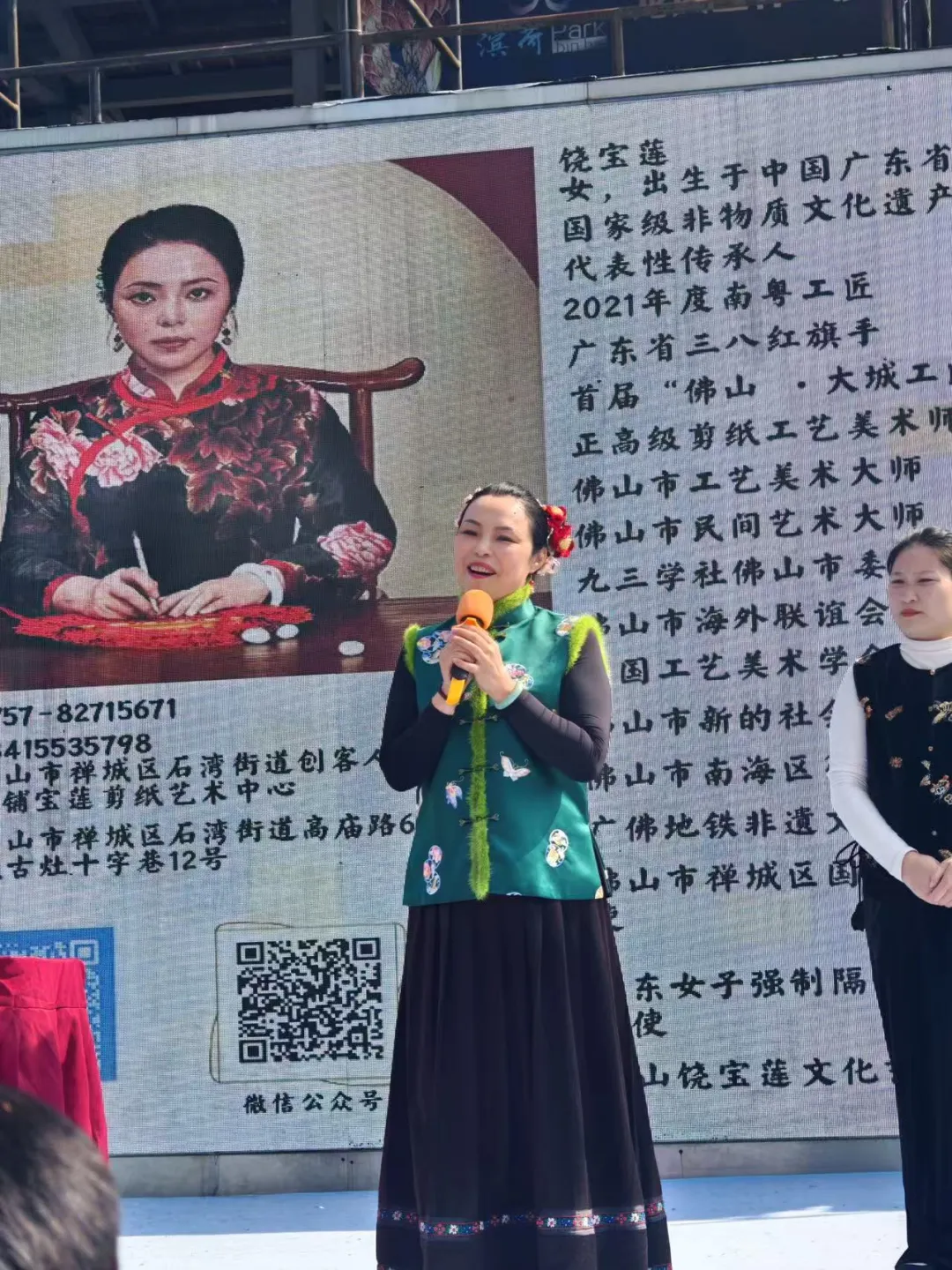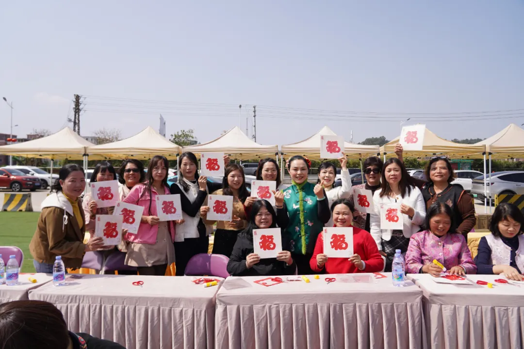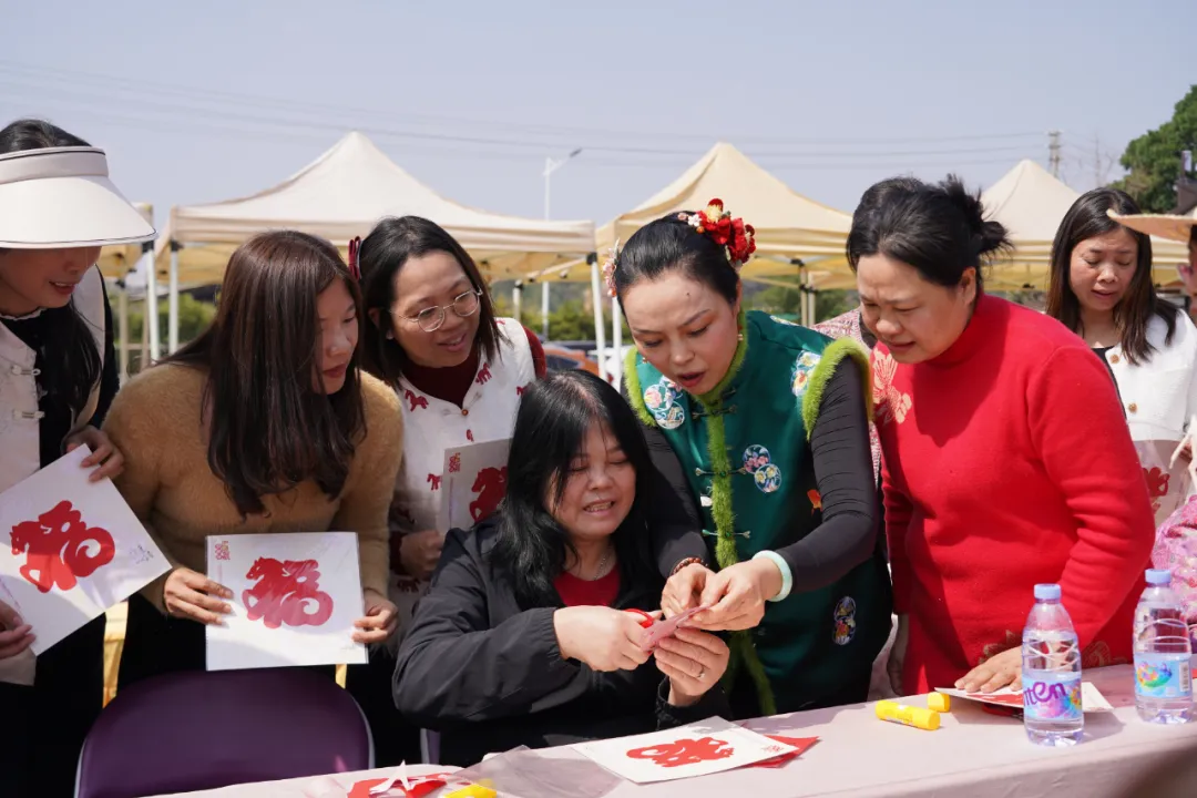 随后,大家移步舞台区,活动重头戏——非遗剪纸体验精彩上演。本次活动特邀国家级非遗剪纸代表性传承人饶宝莲老师莅临指导,高明区相关领导也出席了活动,现场气氛热烈而隆重。饶宝莲老师深情介绍了剪纸艺术的魅力,并登台示范,以纸为媒,剪随心动,顷刻间四幅精致灵动的作品便呈现在众人眼前。体验环节中,饶老师手把手教学,女神们化身为专注的“匠人”,手中的剪刀在红纸上翻飞起舞,行云流水间,一幅幅栩栩如生的“福马”跃然纸上。这不仅是一次对传统非遗文化的致敬,更是一场静心修身的修行。大家手持作品合影留念,纸短情长,定格下最美瞬间。