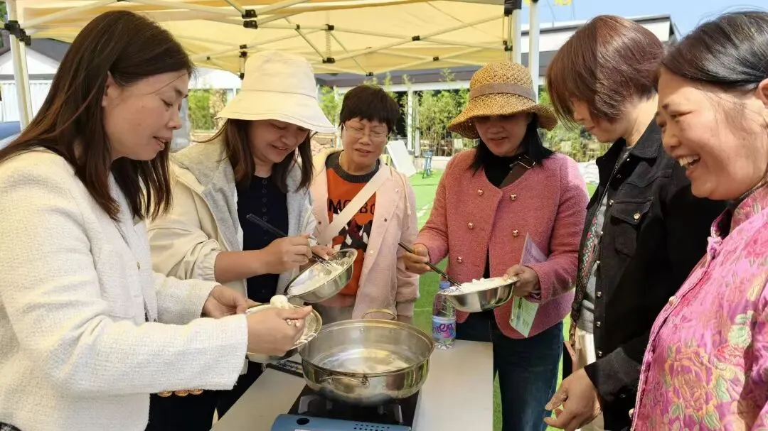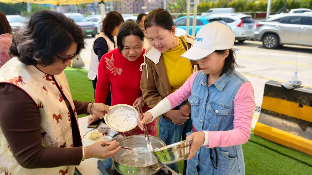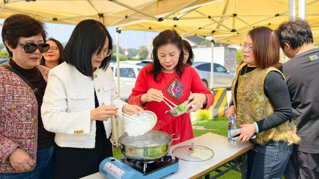 剪纸余韵未了,一场“舌尖上的旅行”悄然开启。活动特邀几位“美女厨神”现场授艺,教学制作高明非遗美食——水菱角。平日里在商海中乘风破浪的女企业家们,此刻纷纷化身温婉厨娘,围着灶台互动频频。“看我的手法对不对?”“哎呀你这个形状太标致了,快教教我!”大家互相纠正手势,欣赏彼此的“作品”。现场妙语连珠,欢笑声不断。