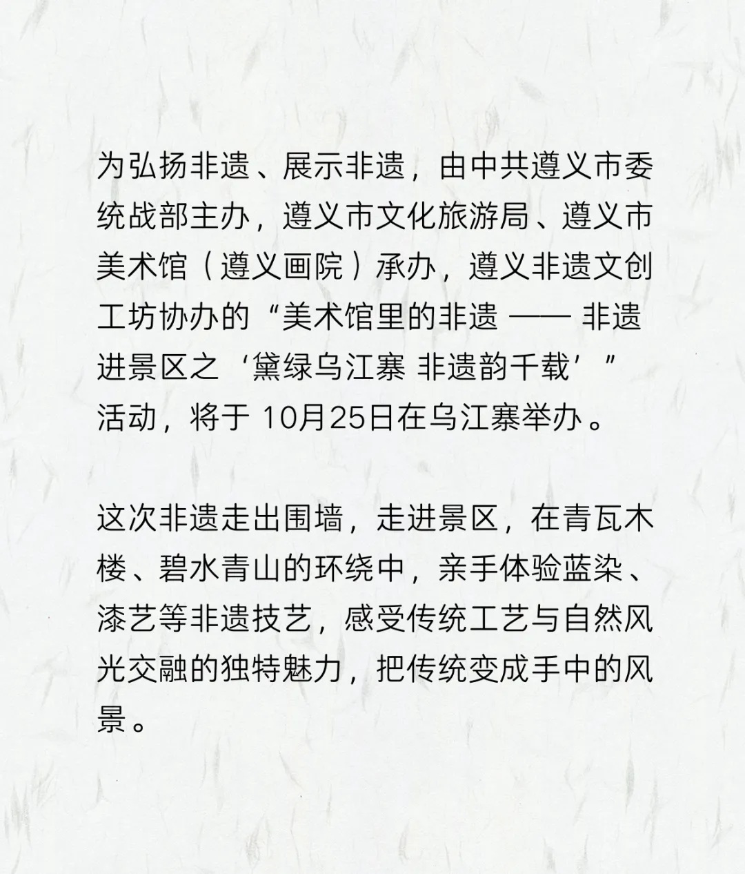 您现在的位置是:首页 > 国内旅游目的推荐 > 正文 国内旅游目的推荐 美术馆里的非遗——走进景区之“黛绿乌江寨 非遗韵千载” admin2026年03月07日 15:15:53国内旅游目的推荐2 美术馆里的非遗——走进景区之“黛绿乌江寨 非遗韵千载”-End- 转载请说明来源于"旅荐网",部分内容转载自网络,如有侵权请联系qlwl@foxmail.com删除 本文地址:https://www.15386.cn/post/136578.html 上一篇 “巾帼风采 卓尔不凡”——西江旅游集团开展“三八”妇女节系列活动 下一篇 “7名外国游客到上海旅游,买了满满40箱中国货” 相关文章 关注丨2026第五届医康养旅游产业创新发展论坛将举办 吉林省这里请所有女士免费逛景区、滑雪、看马戏! 2026.3.7日,苏州,金鸡湖景区 3月14日/21日/28日本溪水洞(含景区电瓶)+午餐一日游150元 康力公司新加坡旅游留念 【项目一线】文物保护+景区升级+非遗传承 麦积区文旅项目建设多点开花加速推进 旅游的乐趣! “7名外国游客到上海旅游,买了满满40箱中国货” “巾帼风采 卓尔不凡”——西江旅游集团开展“三八”妇女节系列活动 收藏丨迎接妇女节!这些景区面向女士免费 发表评论 取消回复 评论列表 这篇文章还没有收到评论,赶紧来抢沙发吧~