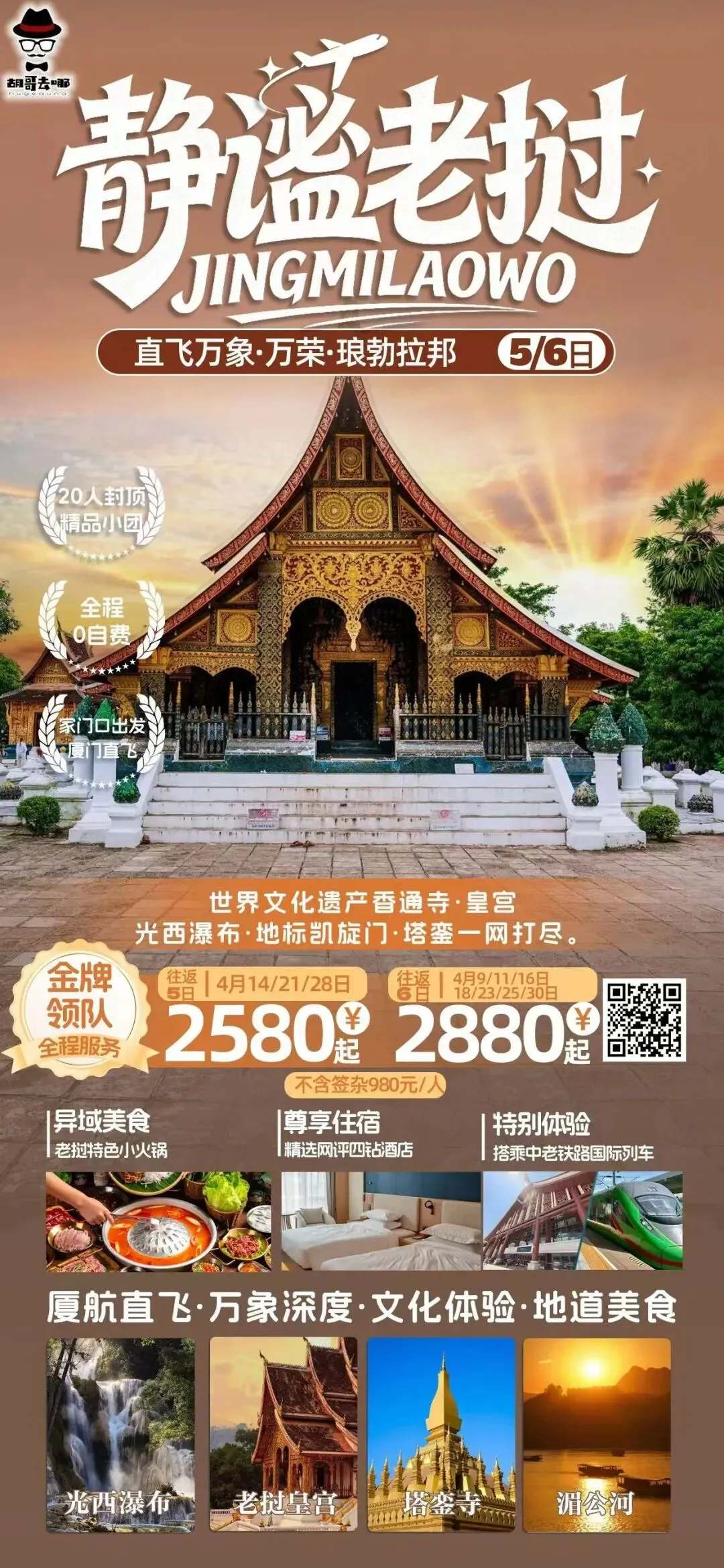 4月老挝旅游包机•厦门直飞万象!老挝3城世界文化遗产香通寺·皇宫光西瀑布·地标凯旋门·塔銮一网打尽!5/6日游任选!