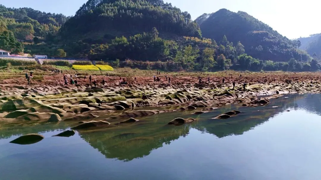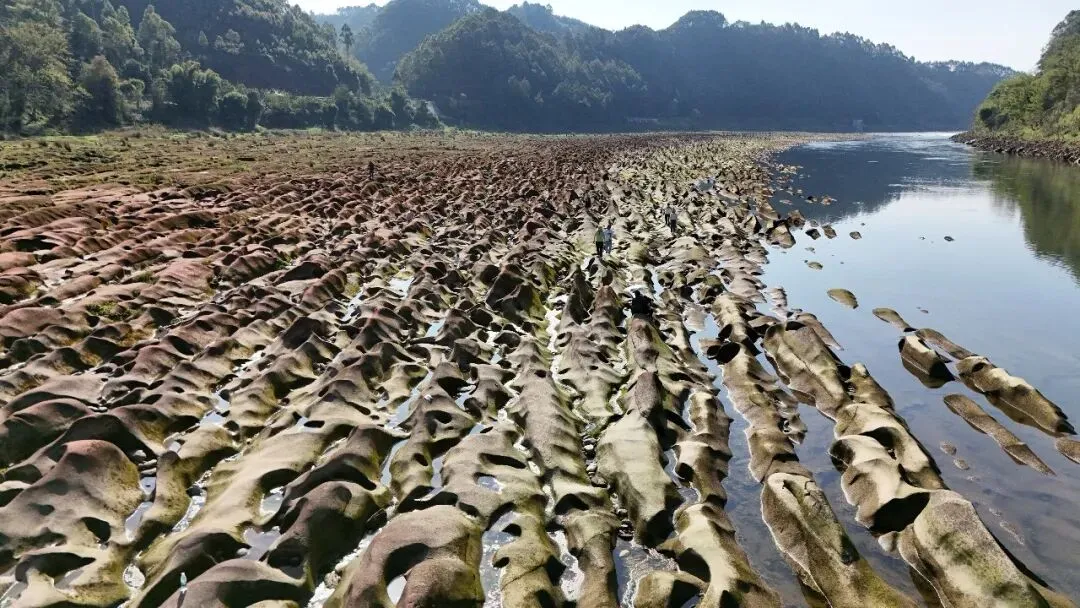 据了解,石鸭子滩地处平羌小三峡平羌峡段,河滩全长1200米、宽100余米,由岷江流水冲刷侵蚀而成,枯水季节巨石全貌显露,形似形态各异的巨鸭卧江,尤为壮观。步入滩涂,大小不一、形态各异的巨石遍布江岸,远观如群鸭游弋碧水之间,“石鸭子” 的称号由此而来。与常见鹅卵石河滩不同,这里以紧密相连的巨型奇石为主,沟壑纵横、水凼遍布,漫步其间宛如置身 “异星地表”,前来打卡拍照的市民游客络绎不绝。
