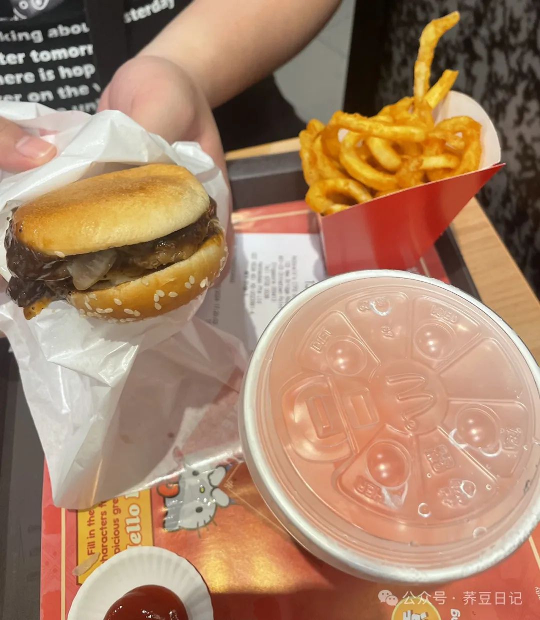 新加坡限定版麦当劳牛肉长堡、姜味汽水和番茄薯条。S?10