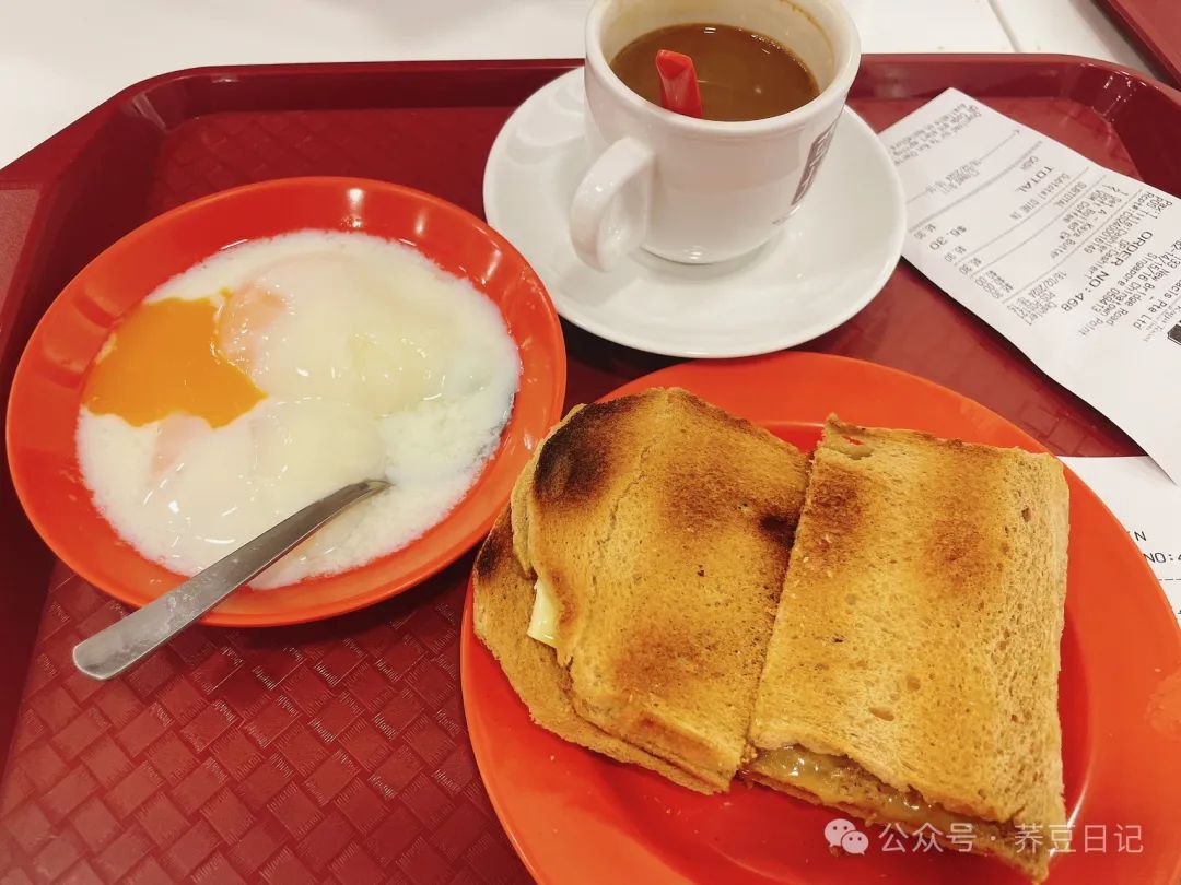 亚坤,被称为国民早餐,吐司片烤的酥脆喷香,夹黄油和椰咖酱,很好吃有特色。养生蛋感觉是生鸡蛋打到某种热热的液体中,不腥,有蛋奶的香气,也挺特别的。S?6.3
