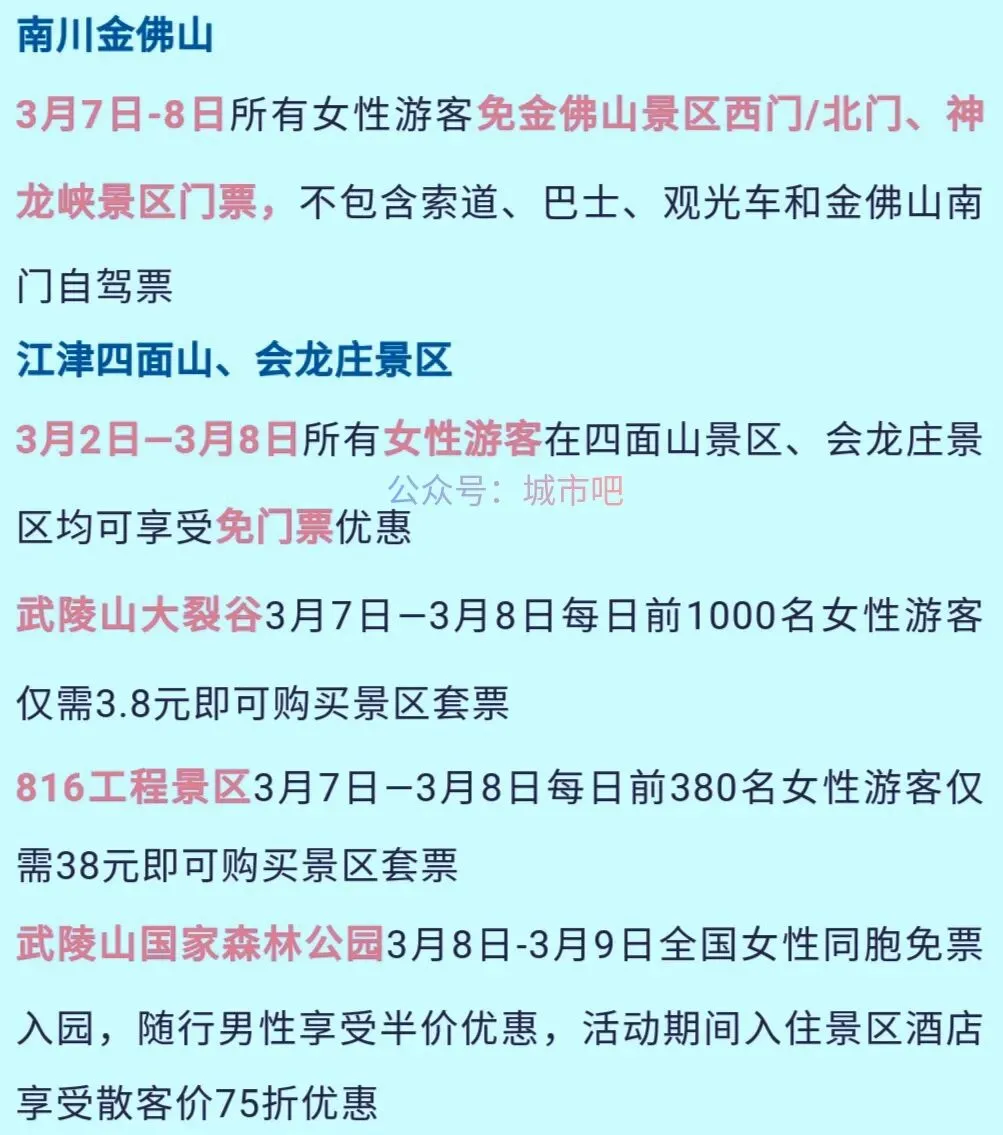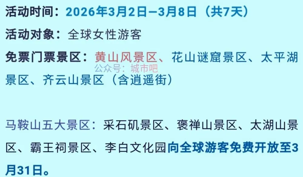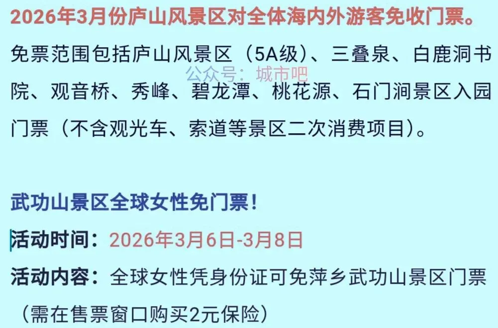 2026年3月,全国各地又有众多景区门票有优惠!本周日是3月8日是“三八”国际劳动妇女节,全国多个景区推出了免门票/半价优惠活动,以下是2026年3月全国各省份/部分热门景区门票免费/优惠最新政策(信息综合自各省文旅、景区官方、权威媒体等,仅供参考,以官方为准,详情请咨询官方),更多景区门票免费/优惠政策,请关注【公众号:城市吧】,持续更新中....