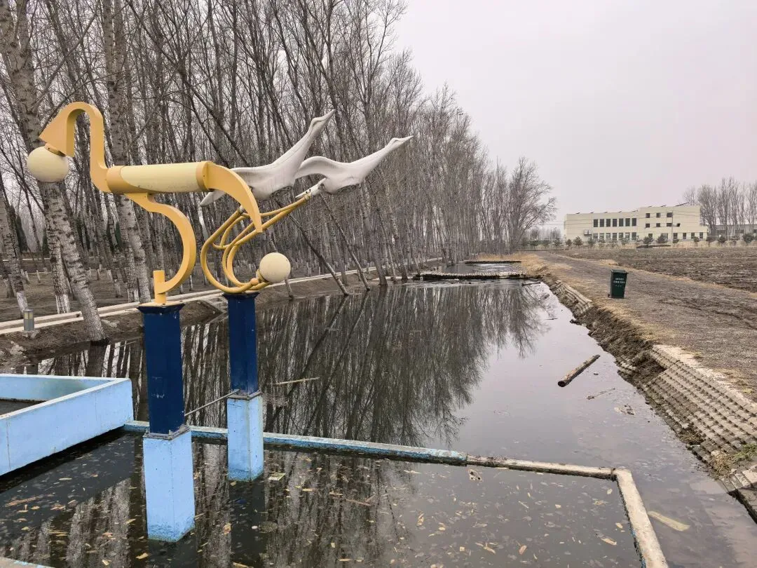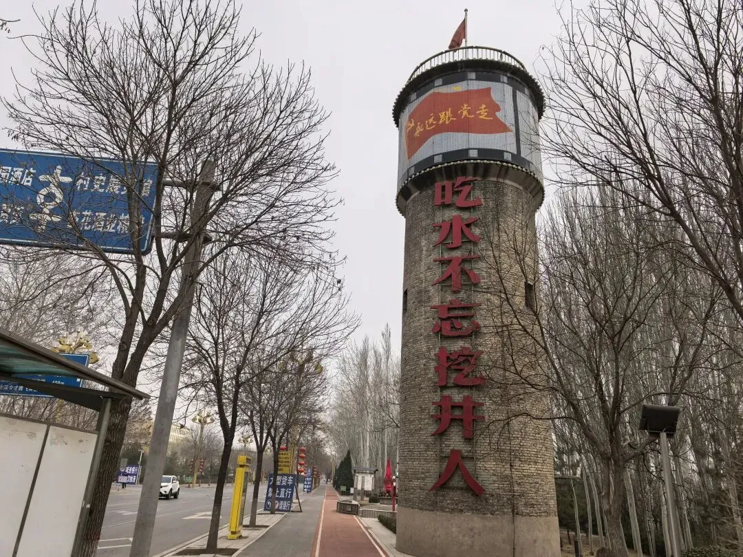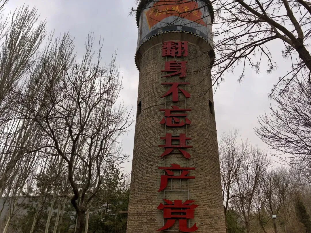 村口水塔。“翻身不忘共产党,吃水不忘挖井人”红色大字格外醒目。