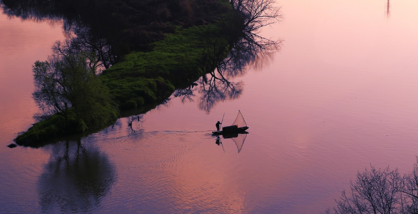 有一江心洲如一轮眉月而得名,它依山伴水,水面平静如镜。春日田野大地金灿灿的油菜花、翠绿的茶叶、古朴的民居点缀得绚丽多姿,使之呈现出一幅中国古代水墨山水画。放眼望去一湾湖水如弯月静卧水面,袖珍的小岛,翠绿的湖水,静谧流淌。笼罩在晨雾中的山峦跌宕起伏,山下黛瓦白墙组成的古村落在袅袅炊烟中呈现