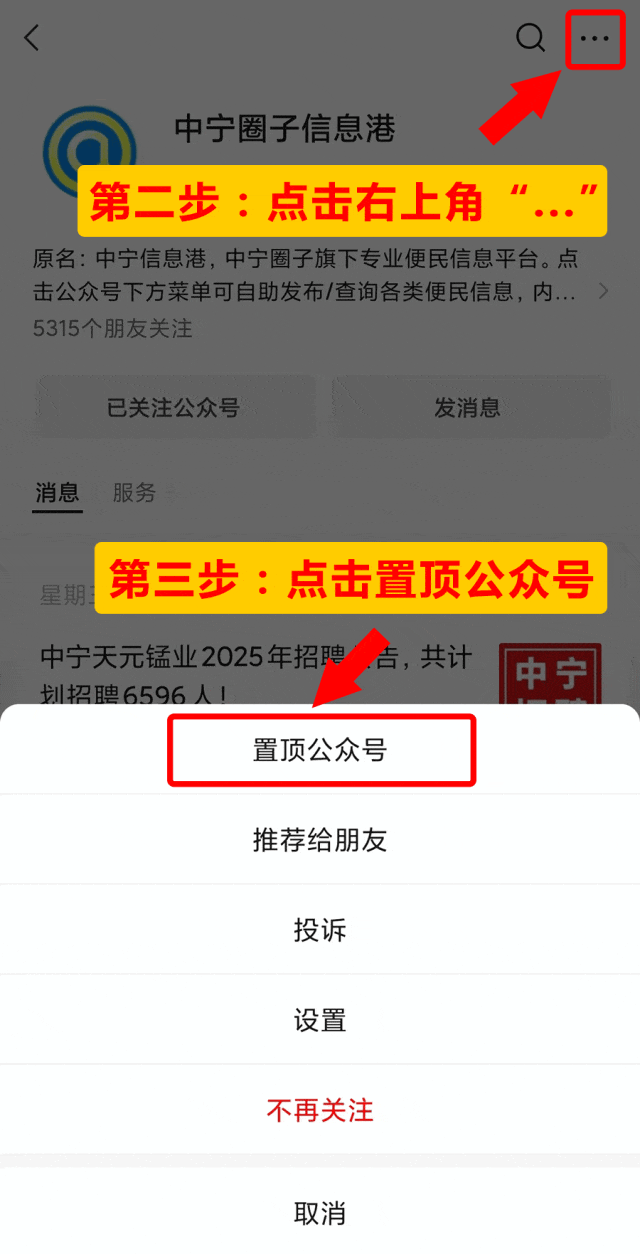 因为微信官方规则更改,服务号被折叠了,有些号找不到了,所以强烈推荐大家把“中宁圈子”、“中宁圈子信息港”置顶,置顶公众号方法如下: