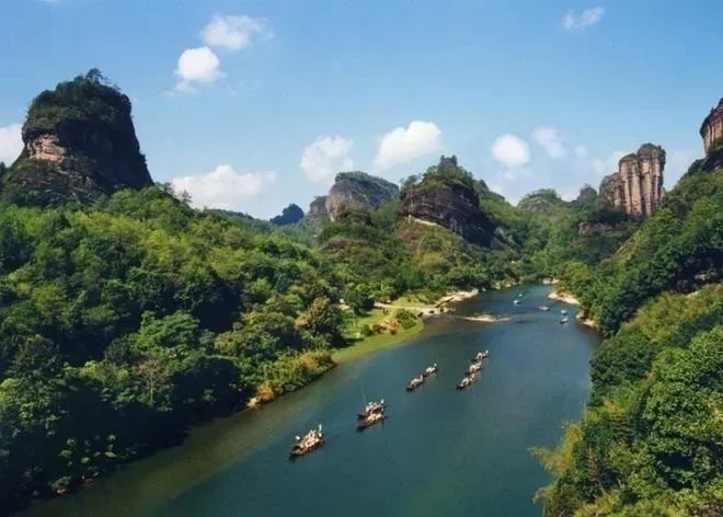 中餐后乘【竹筏九曲溪漂流】 (约2小时),可乘坐宽约2米、长约9米、用六至八根毛竹扎成的古朴竹筏,前部上翘如靴,配数张背竹椅,安坐其上,冲波击浪而下,全程约19华里,有“一溪贯群山,清浅萦九曲;两岸绮列岩岫,倒影浸寒绿”之说,是武夷山风光最精美的部份,沿途观赏九曲,两岸绮丽风光,悬崖绝壁上遗留的“架是“架壑船棺和虹桥板”远观天游峰、玉女峰、。上岸后游览有一千多年的【武夷宫】,【宋街】。
