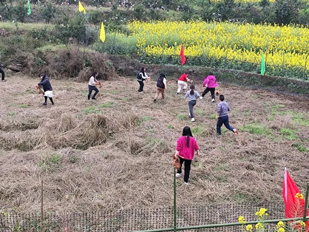 除了浪漫的花海景致,活动还精心策划了多项趣味十足的乡野体验活动,让游客深度感受田园乐趣。每日11:00-11:30、15:30-16:00,“鸡”祥如意·乡野趣味抓鸡赛准时开启,田野间的山鸡撒欢奔跑,游客们可一展身手,抓到的山鸡可直接带走,把春日好彩头抱回家;每日14:00后,“鱼”乐无穷·浑水摸鱼大挑战欢乐上线,不限时长畅玩到底,游客在水塘里摸鱼撒欢,沉浸式体验田园野趣,抓到的鱼也尽数归己,解锁春日最接地气的快乐。