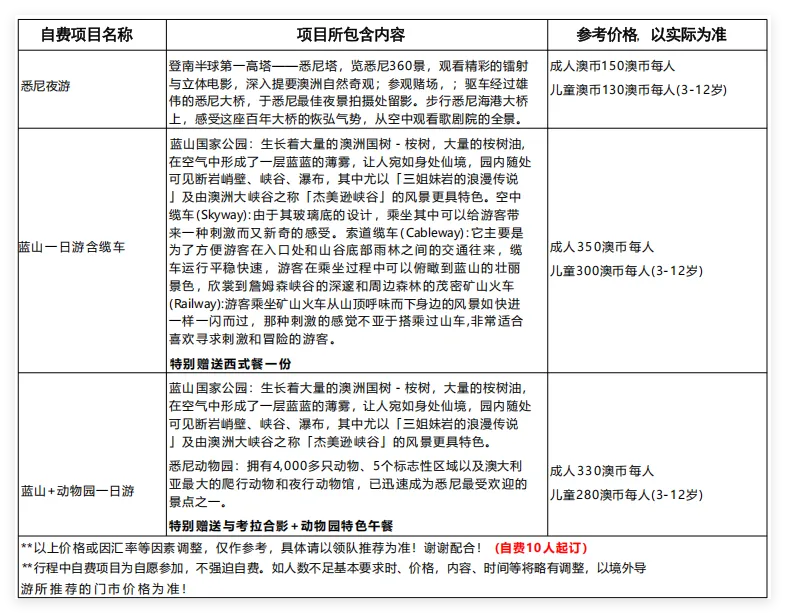 今日自由活动,享受没有MorningCall的一天,全天可自由活动随心游。 推荐自费: 【蓝山国家公园】生长着大量的澳洲国树-桉树,大量的桉树油,在空气中形成了一层蓝蓝的薄雾,让人 宛如身处仙境,园内随处可见断岩峭壁、峡谷、瀑布,其中尤以「三姐妹岩的浪漫传说」及由澳洲大峡谷之 称「杰美逊峡谷」的风景更具特色。当您步入风景如画的原始森林国家公园时,整个空气中散发著尤加利树 的清香,给您一种返朴归真的世外桃源般的感受。 【悉尼动物园】拥有4000多只动物、5个标志性区域以及澳大利亚最大的爬行动物和夜行动物馆,已迅速 成为悉尼最受欢迎的景点之一。您可以看到针鼹、袋熊、袋獾、澳洲野狗和许多其他珍惜的物种,可以近距 离看到袋鼠、小袋鼠、鸸鹋等来澳洲必看的小动物们。当然您还可以看到许多夜行和冷血动物,比如蝙蝠、 蜥蜴以及各种各样的昆虫。当然也不能少了海洋生物,当地特色的水族馆里可以看到大鲨鱼、可爱的小企鹅 和庞大的咸水鳄鱼等。动物园内设施齐全无障碍,方便人群行走以及参观。悉尼动物园一定让你不虚此行, 动物们等着您的到来。