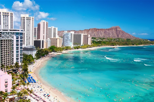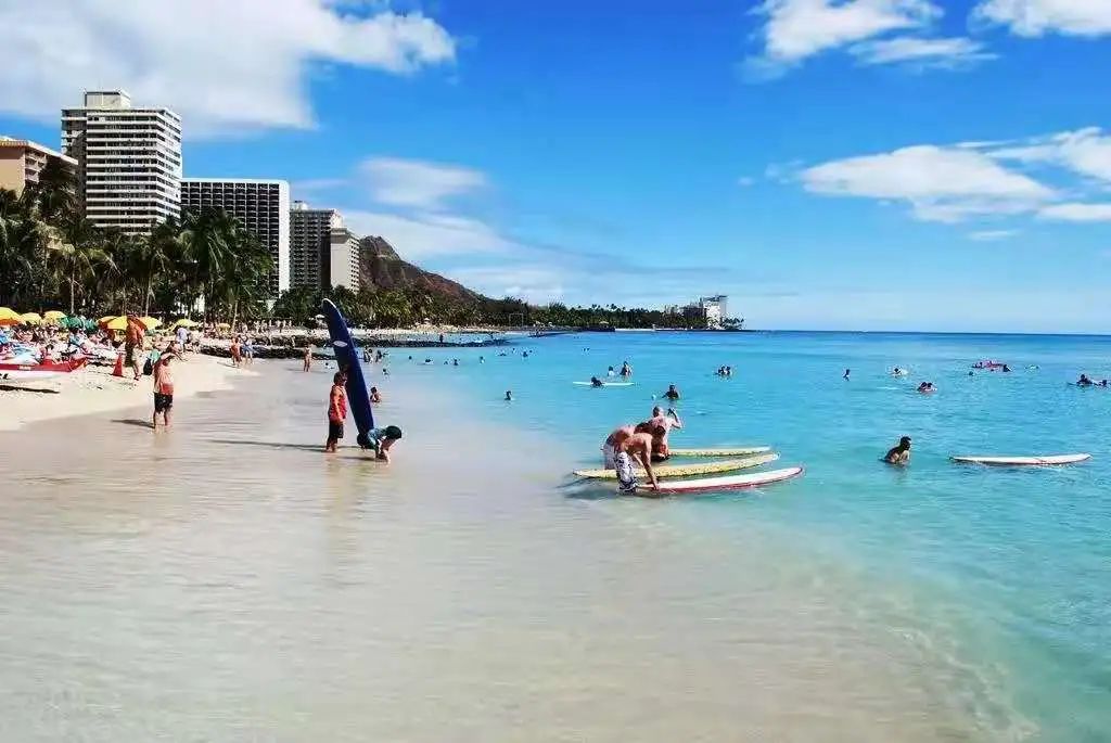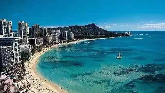 威基基海滩位于夏威夷首府檀香山市,是世界上最著名的海滩,这里有细软洁白的沙滩、摇曳多姿的椰子树以及林立的高楼大厦。