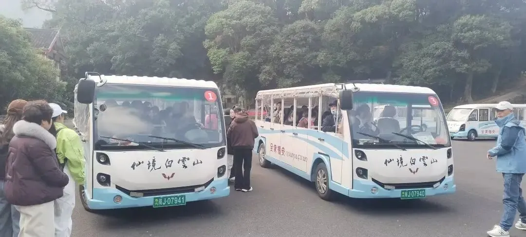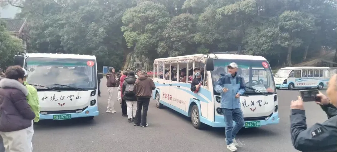 职工们抵达白云山景区后,在景交车前有序排队,等待乘坐车辆。大家满怀期待,向着白云深处进发