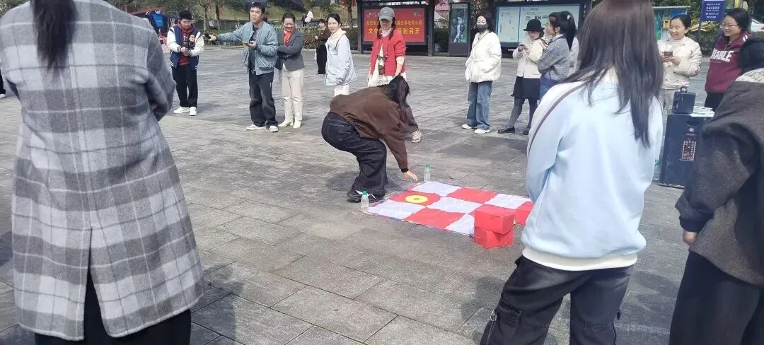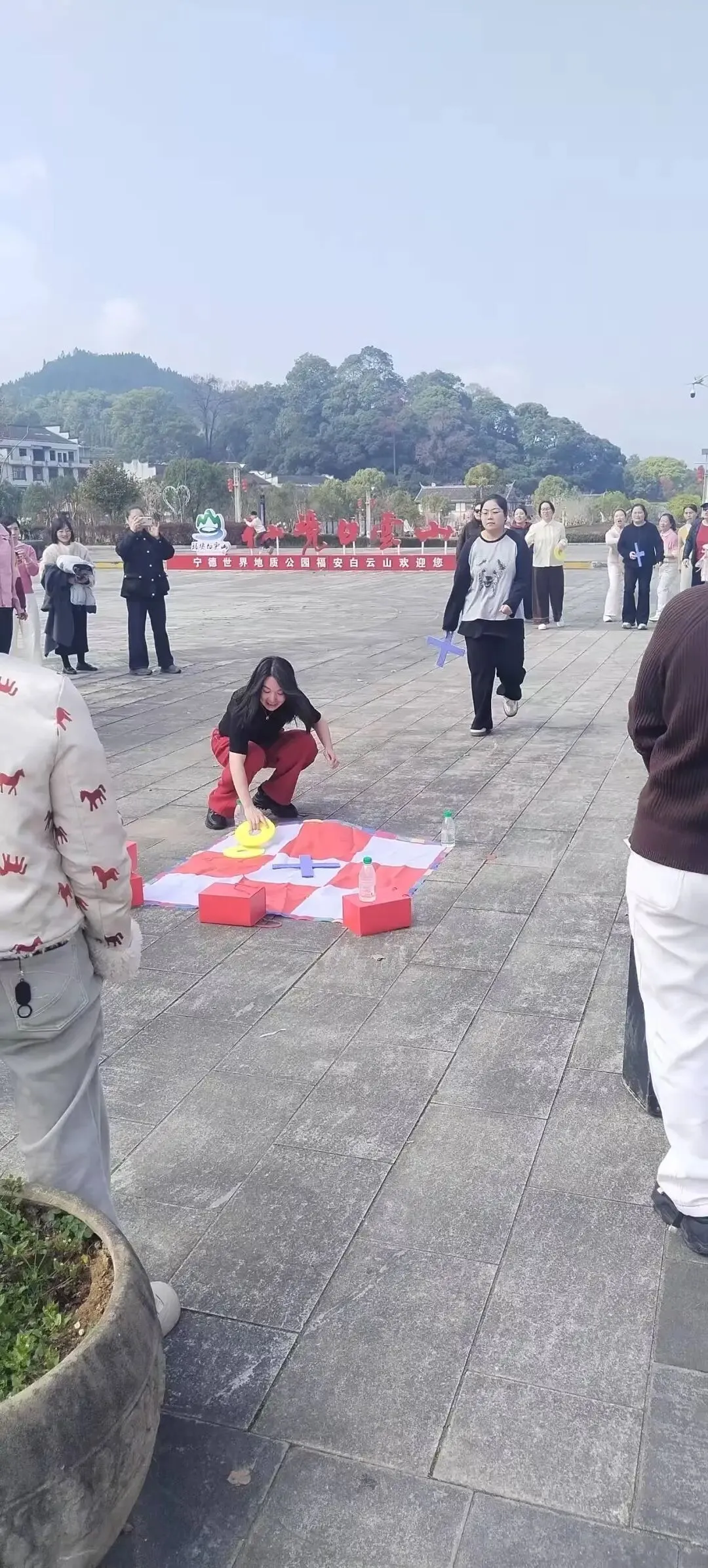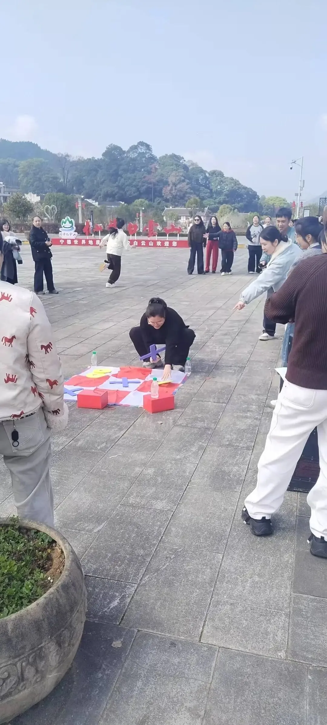 在白云山广场上,一场别开生面的趣味团建热闹展开。地上铺开红白格子塑料布,大家围在九宫格前,用海绵制作的巨型“XO”棋子展开三子棋对决