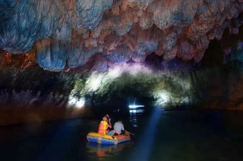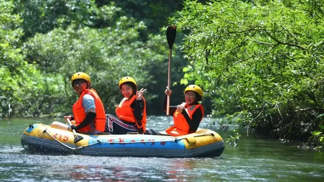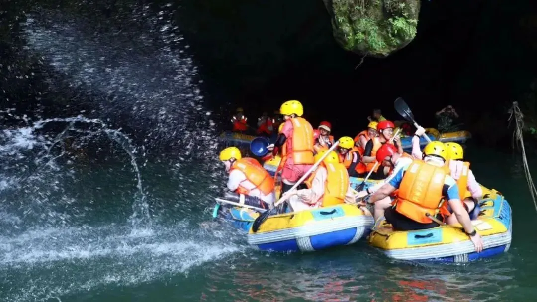 驾驶着爱的皮筏艇,时而随激流波荡,时而凭静水悠然,凭借出色合作让皮筏艇在颠簸中依然保持平稳,穿过奇峰异石、幽幽林海、飞瀑流泉、绚丽溶洞,感受“昼夜更替”的奇妙,轻松甩开炎热与烦恼。