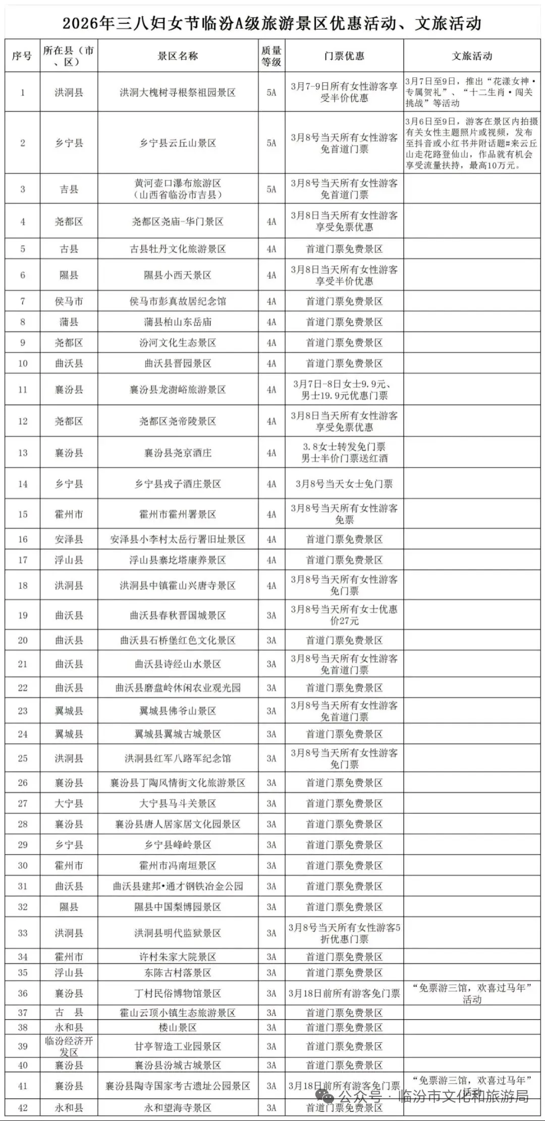 近日,从临汾市文化和旅游局了解到在第116个“三八”国际妇女节来临之际我市推出一系列A级旅游景区门票优惠及特色文旅活动。