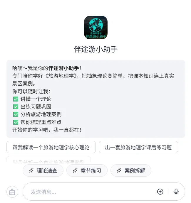 旅游地理学“伴途游小助手”智能体界面