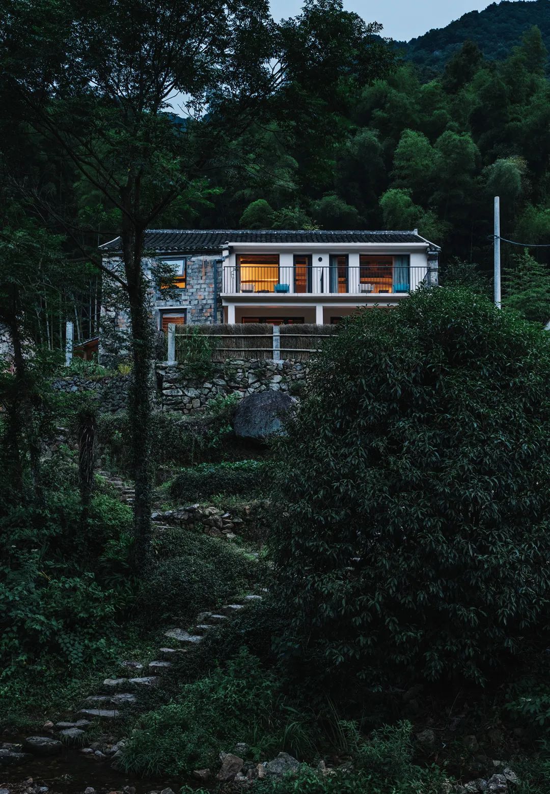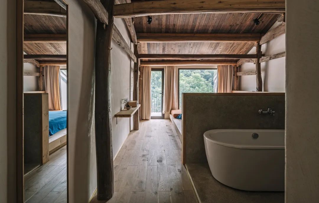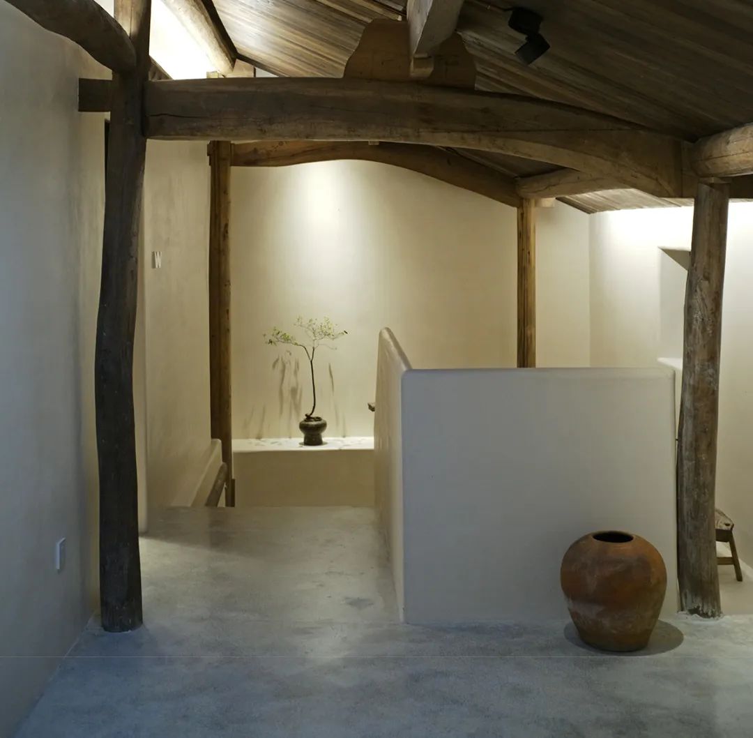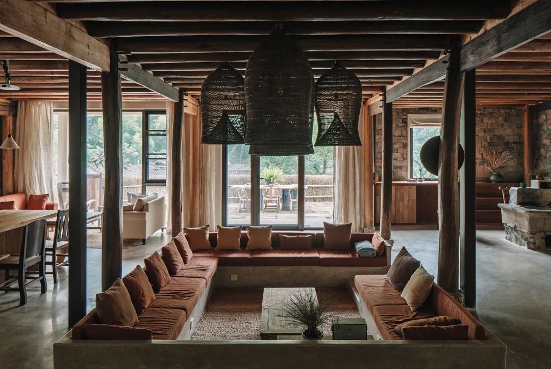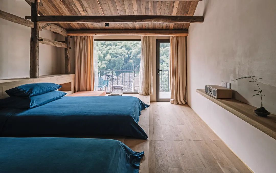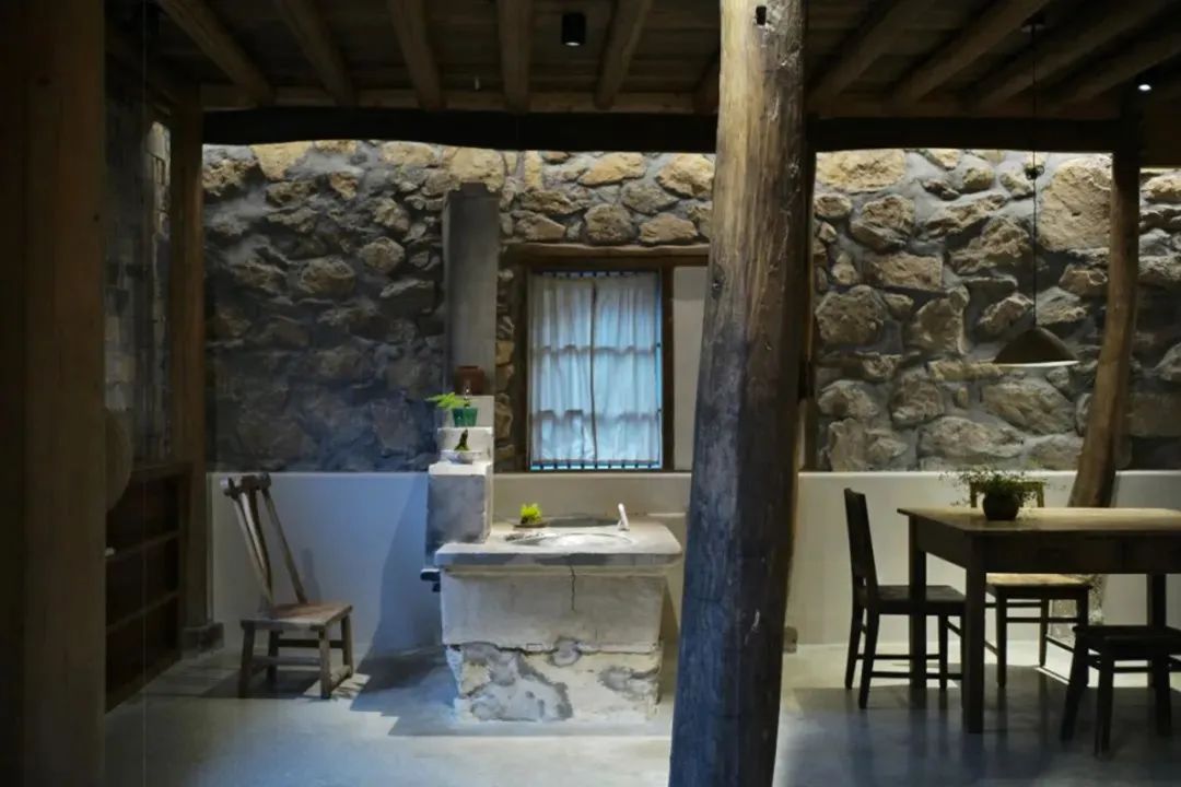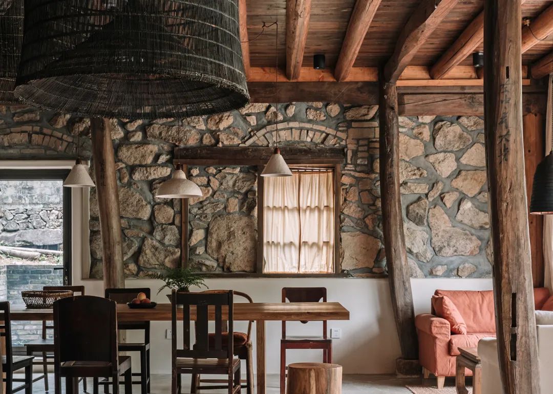 本期《美宿中国》介绍的台州临海小芝镇胜坑村的草宿·崇民家,即属于当下中国民宿中极少数主人自己长期居住于此,并且从土建到服务都亲力亲为的民宿。数年来,从草宿一期到二期,主人有滋有味地讲述着将田园梦想付诸实现的故事。连明星周迅、毛不易、阿雅等,都趁录制综艺节目之机来这里探访过,留下了许多欢声笑语。坐落在深山里的胜坑村,历史可上溯至南宋。平时静谧得让人恍惚,堪称浙东秘境。这里山石资源丰富,村民就地取材,以石块砌房和修路。村中除却几户老人留守,已鲜有年轻人留驻。不过,这样的古村,却正好符合一对城里的夫妻——水草和晖哥对理想家园的憧憬。于是两人不顾家人和亲朋的阻挡,带着3岁的儿子,卖掉杭州的两套房产,搬来此地生活。村民们看着这两个外地人既出钱,又出力,改造别人家近乎坍塌的石头屋,都觉得不可思议。草宿一期是两人自己打理,就住在民宿里,自己待客,自己做饭。没想到,民宿不仅维持下来,还经营得有声有色,石屋重新焕发出生机与活力。夫妻俩人每日在鸡鸣狗叫中起床,在炊烟袅袅中生活,村民们的将信将疑也变成了友好与信任。2018年,草宿一期运营两年整,水草和晖哥准备开启第二轮改造计划。一位叫崇民的大叔主动把自己一套快荒废的老房子托付给他俩,于是二期便被称为“草宿·崇民家”。老宅位于胜坑村最高点,视野开阔,依山傍水。与村里其它民房保持一定距离,十分安静。在当初草宿一期改造时,由于一切从零开始,所有工作都得摸索着来,光是施工队伍就前前后后换了三拨,让晖哥心力交瘁,苦不堪言。二期改造工作吸取了经验教训,避开了原先踩过的一个个坑,晖哥更是亲自做起了包工头。一个篱笆三个桩,一个好汉三个帮。就像一群老友合计着呈现一件作品,二期工程循序渐进,颇有章法,大家其乐融融。主持设计师张健对夫妻二人的生活态度非常认同,“他们两个愿意待在村里,属于那种守得住的人,内心沉得下来。”由于胜坑村是受保护的古村,不允许做大规模外立面改造。于是张健在原有建筑的基础上,尽量减少出挑的设计,扩建也很克制。草宿二期希望可以满足两到三个家庭的居住需求,项目有两层楼,一楼按村民日常使用习惯,打造为一家人共同使用的客厅、餐厅和厨房。客厅采取别有特色的下沉式设计,一进屋子,就让人不自觉地踢掉拖鞋,窝进舒服的沙发里,看书、听音乐、唠家常。水磨石座位上铺着厚厚的软垫,舒服惬意。抬起头,悬挂的灯罩是设计师特意从巴厘岛淘来的渔具,肚子大口子小,当地渔民把它们放入水中,鱼虾一旦从底部钻入就如进了迷宫,几乎难以逃脱。这万里之外的异域“客人”,跟这土生土长的浙江山村竟然毫不违和,简直是量身定制。客厅还保留了祖屋原有的灶台,放把竹椅,就可以像从前那样给灶台添把火。灶台边放着一张江南农村常见的四方桌,搭配几把木椅木凳,此番景象,轻松得就像在邻居家做客。民宿一期的客厅墙体基本维持了原本的石头砌筑,还原了村民家原始的建筑形态。二期的草宿·崇民家做了一些变化,腰线以下墙体平整刷白,显得更加干净整洁明亮,方便打理。腰线以上的石头也做了柔化处理,磨去尖锐部分,嵌入水泥,让屋内视觉效果变得更加亲切。屋顶的老房梁虽然弯曲,却自有朴拙的美感,在时间的流逝中表面产生了一层富有光泽的包浆。设计师将其完整保留下来,依旧可靠地支撑着房屋。厨房区域分为内外两间。内厨各项中餐器具一应俱全,便于煎炒烹炸;外厨趋向于西厨,有开敞式操作台和清洗池,边上的横梁上随意悬挂着农居生活必备的篮筐、纱布、竹篓,既实用又方便装饰。“原本的木楼梯很陡,几乎无法使用。”经过一番改造后,现在的楼梯多了一些雅致,以圆润的扶手,搭配白色墙体和水磨石台阶,光脚都能感觉到材质的细腻和清爽。上至二楼,墙边小台上看似不经意,实则悉心摆设了日常使用的桌椅板凳和水缸瓦罐,营造出山居生活的悠闲和舒适。随手插上一支现摘的绿植,顿时生机盎然。崇民家一共3间卧室,连同一楼公区和院子整栋出租。卧室内同样保留了看起来拙而美的木头梁柱,床品、毛巾、睡衣等,一如既往选用草宿自产的板蓝根染织品,环保舒适,还有杀菌功效。夜晚,把自己装进被窝里,淡淡的草木气息令人安心,在水声与虫鸣声中酣然入睡。独立而私密的空间,辅以舒适的现代生活设施,非常适合小范围的朋友和家庭聚会。设计师尽量维持老屋原貌,只是按照功能需求,去除了一部分原有屋檐的连廊,在二楼扩建了阳台。张健认为,“大部分客人是来度假的,希望能跟户外有比较好的接触。所以民宿客房最好有独立的露台,或有一个私家小院落。”草宿·崇民家的调性被定义为乡野民居,所有元素都取材于本地,从外观的石墙到内部软装,完全融入周边村落环境。