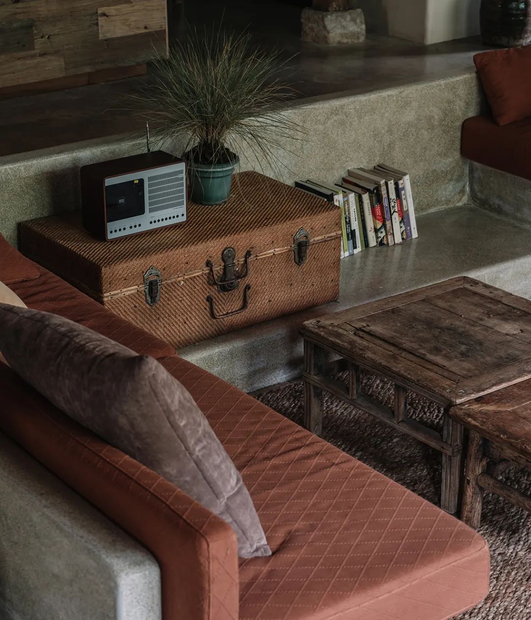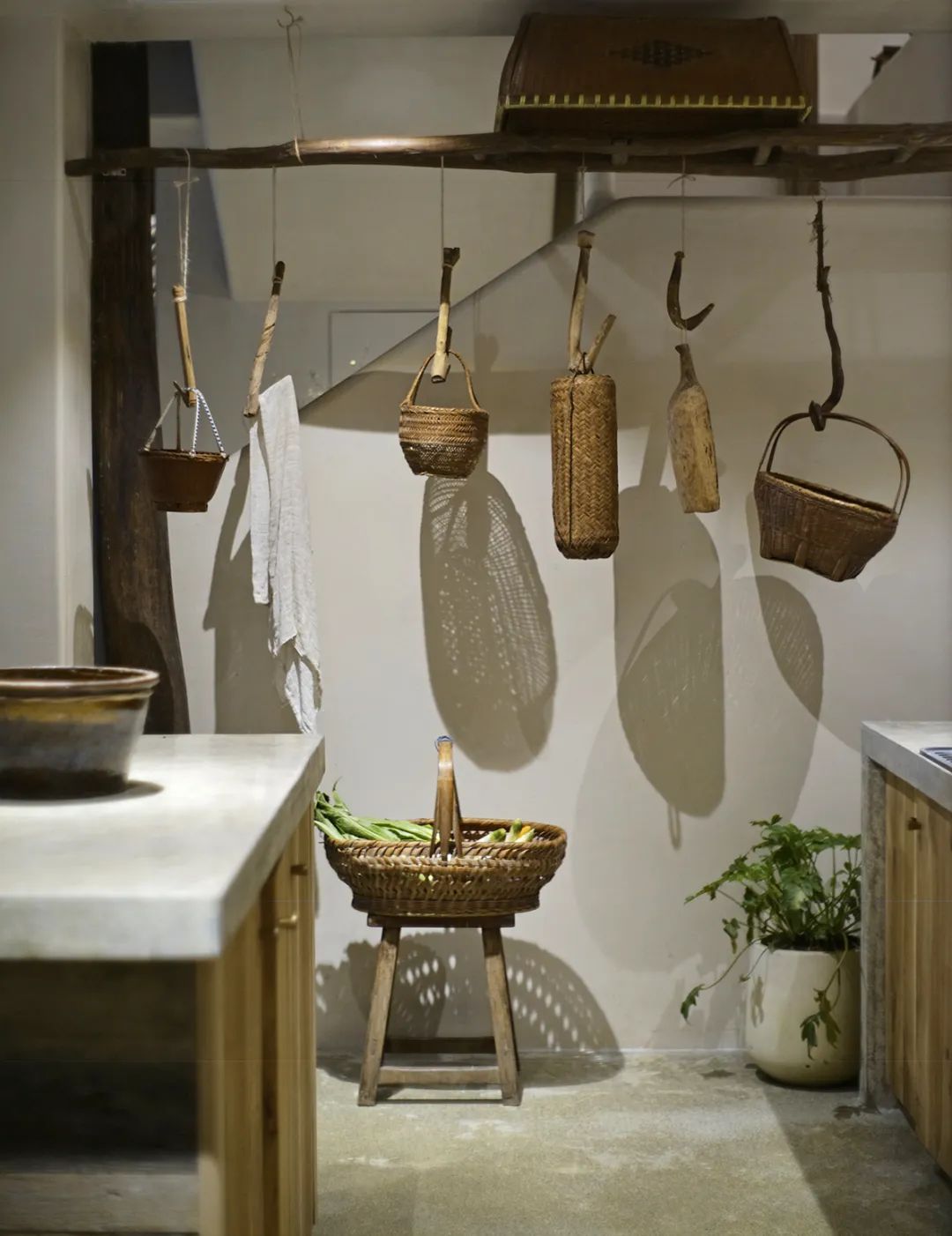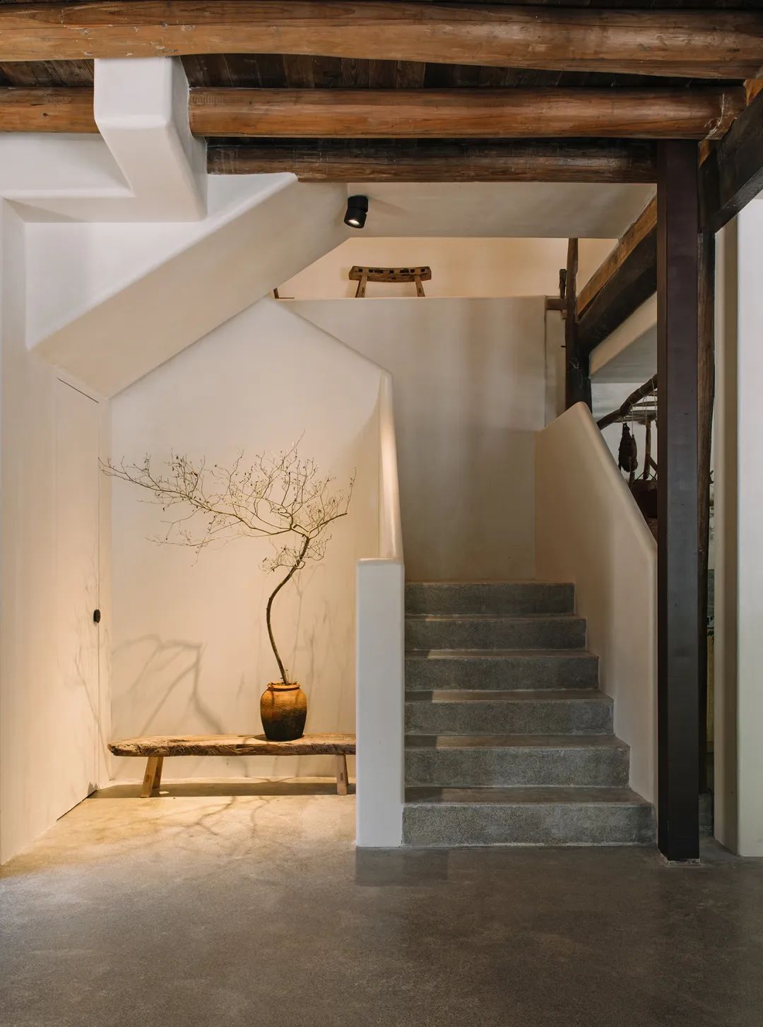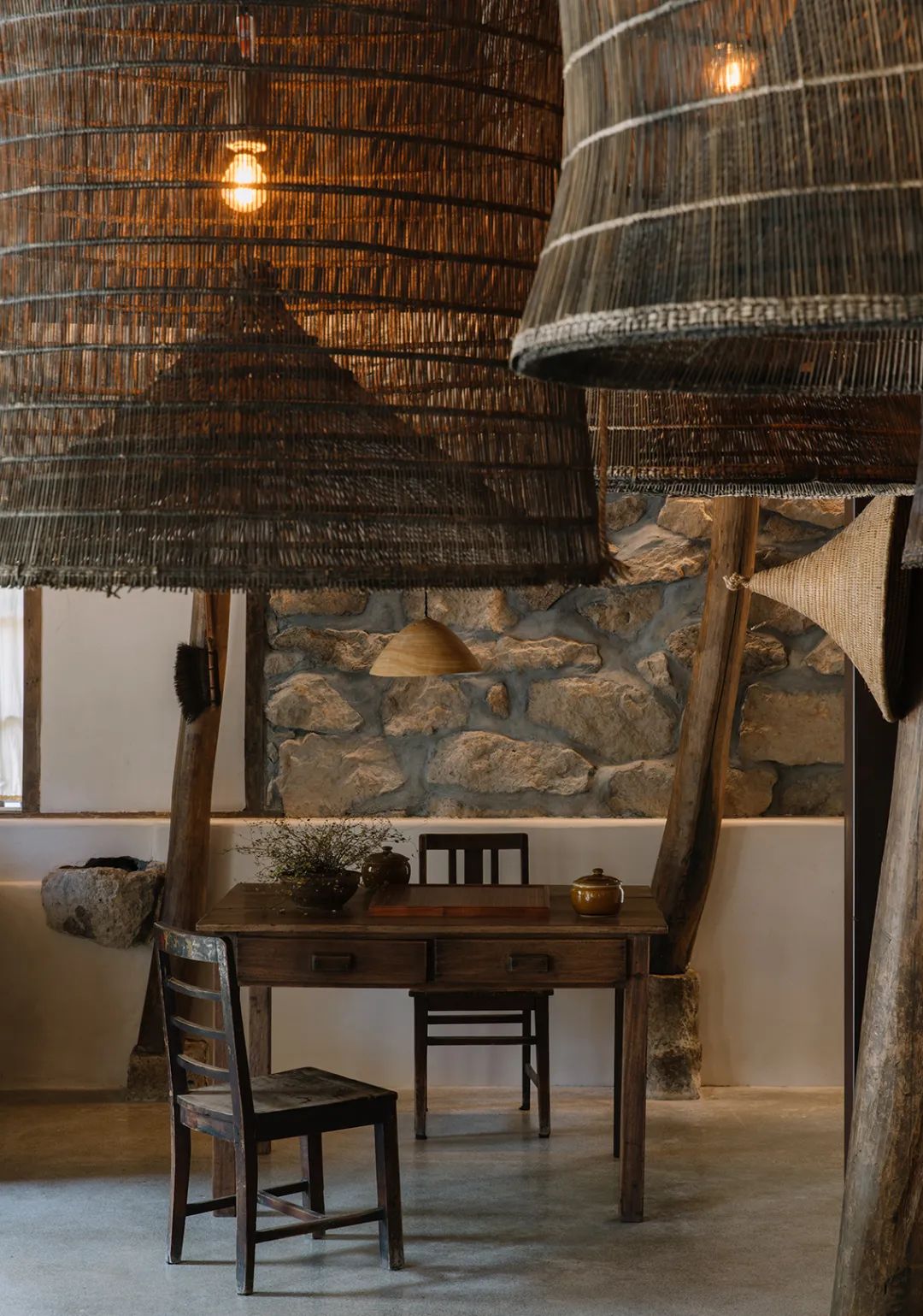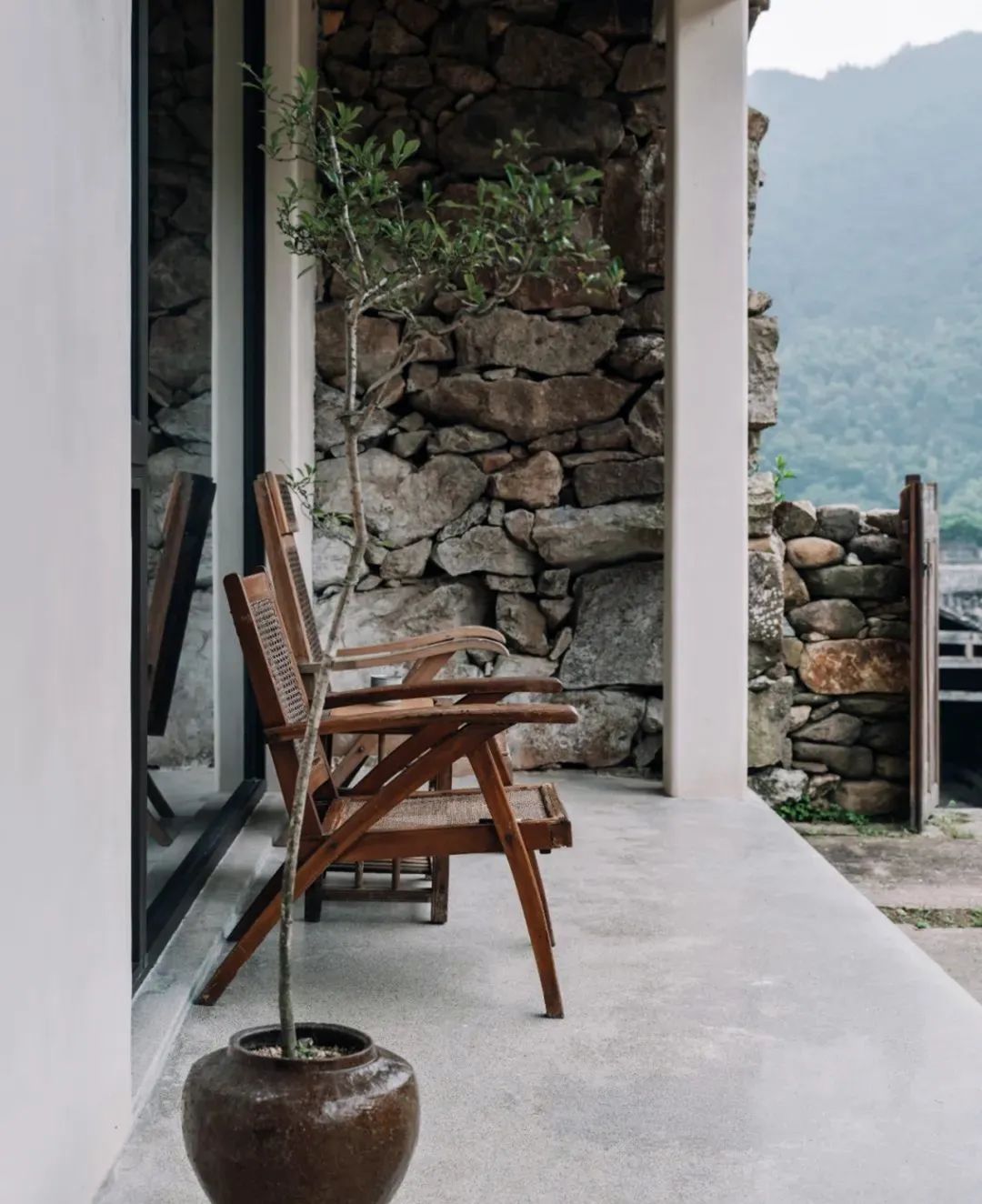 本期《美宿中国》介绍的台州临海小芝镇胜坑村的草宿·崇民家,即属于当下中国民宿中极少数主人自己长期居住于此,并且从土建到服务都亲力亲为的民宿。数年来,从草宿一期到二期,主人有滋有味地讲述着将田园梦想付诸实现的故事。连明星周迅、毛不易、阿雅等,都趁录制综艺节目之机来这里探访过,留下了许多欢声笑语。坐落在深山里的胜坑村,历史可上溯至南宋。平时静谧得让人恍惚,堪称浙东秘境。这里山石资源丰富,村民就地取材,以石块砌房和修路。村中除却几户老人留守,已鲜有年轻人留驻。不过,这样的古村,却正好符合一对城里的夫妻——水草和晖哥对理想家园的憧憬。于是两人不顾家人和亲朋的阻挡,带着3岁的儿子,卖掉杭州的两套房产,搬来此地生活。村民们看着这两个外地人既出钱,又出力,改造别人家近乎坍塌的石头屋,都觉得不可思议。草宿一期是两人自己打理,就住在民宿里,自己待客,自己做饭。没想到,民宿不仅维持下来,还经营得有声有色,石屋重新焕发出生机与活力。夫妻俩人每日在鸡鸣狗叫中起床,在炊烟袅袅中生活,村民们的将信将疑也变成了友好与信任。2018年,草宿一期运营两年整,水草和晖哥准备开启第二轮改造计划。一位叫崇民的大叔主动把自己一套快荒废的老房子托付给他俩,于是二期便被称为“草宿·崇民家”。老宅位于胜坑村最高点,视野开阔,依山傍水。与村里其它民房保持一定距离,十分安静。在当初草宿一期改造时,由于一切从零开始,所有工作都得摸索着来,光是施工队伍就前前后后换了三拨,让晖哥心力交瘁,苦不堪言。二期改造工作吸取了经验教训,避开了原先踩过的一个个坑,晖哥更是亲自做起了包工头。一个篱笆三个桩,一个好汉三个帮。就像一群老友合计着呈现一件作品,二期工程循序渐进,颇有章法,大家其乐融融。主持设计师张健对夫妻二人的生活态度非常认同,“他们两个愿意待在村里,属于那种守得住的人,内心沉得下来。”由于胜坑村是受保护的古村,不允许做大规模外立面改造。于是张健在原有建筑的基础上,尽量减少出挑的设计,扩建也很克制。草宿二期希望可以满足两到三个家庭的居住需求,项目有两层楼,一楼按村民日常使用习惯,打造为一家人共同使用的客厅、餐厅和厨房。客厅采取别有特色的下沉式设计,一进屋子,就让人不自觉地踢掉拖鞋,窝进舒服的沙发里,看书、听音乐、唠家常。水磨石座位上铺着厚厚的软垫,舒服惬意。抬起头,悬挂的灯罩是设计师特意从巴厘岛淘来的渔具,肚子大口子小,当地渔民把它们放入水中,鱼虾一旦从底部钻入就如进了迷宫,几乎难以逃脱。这万里之外的异域“客人”,跟这土生土长的浙江山村竟然毫不违和,简直是量身定制。客厅还保留了祖屋原有的灶台,放把竹椅,就可以像从前那样给灶台添把火。灶台边放着一张江南农村常见的四方桌,搭配几把木椅木凳,此番景象,轻松得就像在邻居家做客。民宿一期的客厅墙体基本维持了原本的石头砌筑,还原了村民家原始的建筑形态。二期的草宿·崇民家做了一些变化,腰线以下墙体平整刷白,显得更加干净整洁明亮,方便打理。腰线以上的石头也做了柔化处理,磨去尖锐部分,嵌入水泥,让屋内视觉效果变得更加亲切。屋顶的老房梁虽然弯曲,却自有朴拙的美感,在时间的流逝中表面产生了一层富有光泽的包浆。设计师将其完整保留下来,依旧可靠地支撑着房屋。厨房区域分为内外两间。内厨各项中餐器具一应俱全,便于煎炒烹炸;外厨趋向于西厨,有开敞式操作台和清洗池,边上的横梁上随意悬挂着农居生活必备的篮筐、纱布、竹篓,既实用又方便装饰。“原本的木楼梯很陡,几乎无法使用。”经过一番改造后,现在的楼梯多了一些雅致,以圆润的扶手,搭配白色墙体和水磨石台阶,光脚都能感觉到材质的细腻和清爽。上至二楼,墙边小台上看似不经意,实则悉心摆设了日常使用的桌椅板凳和水缸瓦罐,营造出山居生活的悠闲和舒适。随手插上一支现摘的绿植,顿时生机盎然。崇民家一共3间卧室,连同一楼公区和院子整栋出租。卧室内同样保留了看起来拙而美的木头梁柱,床品、毛巾、睡衣等,一如既往选用草宿自产的板蓝根染织品,环保舒适,还有杀菌功效。夜晚,把自己装进被窝里,淡淡的草木气息令人安心,在水声与虫鸣声中酣然入睡。独立而私密的空间,辅以舒适的现代生活设施,非常适合小范围的朋友和家庭聚会。设计师尽量维持老屋原貌,只是按照功能需求,去除了一部分原有屋檐的连廊,在二楼扩建了阳台。张健认为,“大部分客人是来度假的,希望能跟户外有比较好的接触。所以民宿客房最好有独立的露台,或有一个私家小院落。”草宿·崇民家的调性被定义为乡野民居,所有元素都取材于本地,从外观的石墙到内部软装,完全融入周边村落环境。
