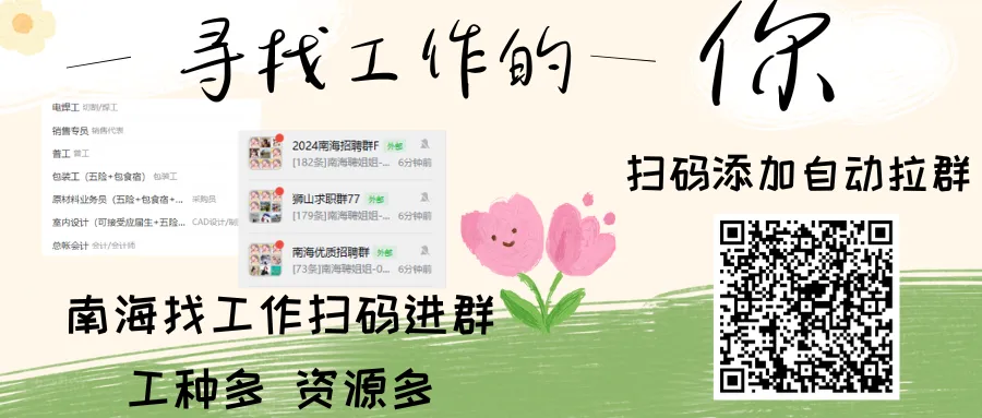 “南海淼才网” 关注公众号,为你推荐南海本地优质岗位 ↓↓↓ “新三水淼才网” 关注公众号,为你推荐南海本地优质岗位 ↓↓↓ 诚聘 旅游|包食宿 公司地址: 往期招聘信息合集 ↓↓↓ 狮山招聘丹灶招聘大沥招聘桂城招聘普工招聘