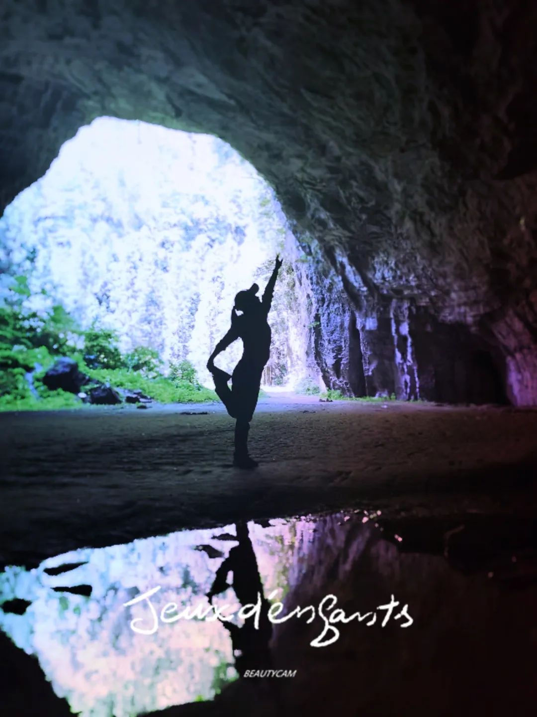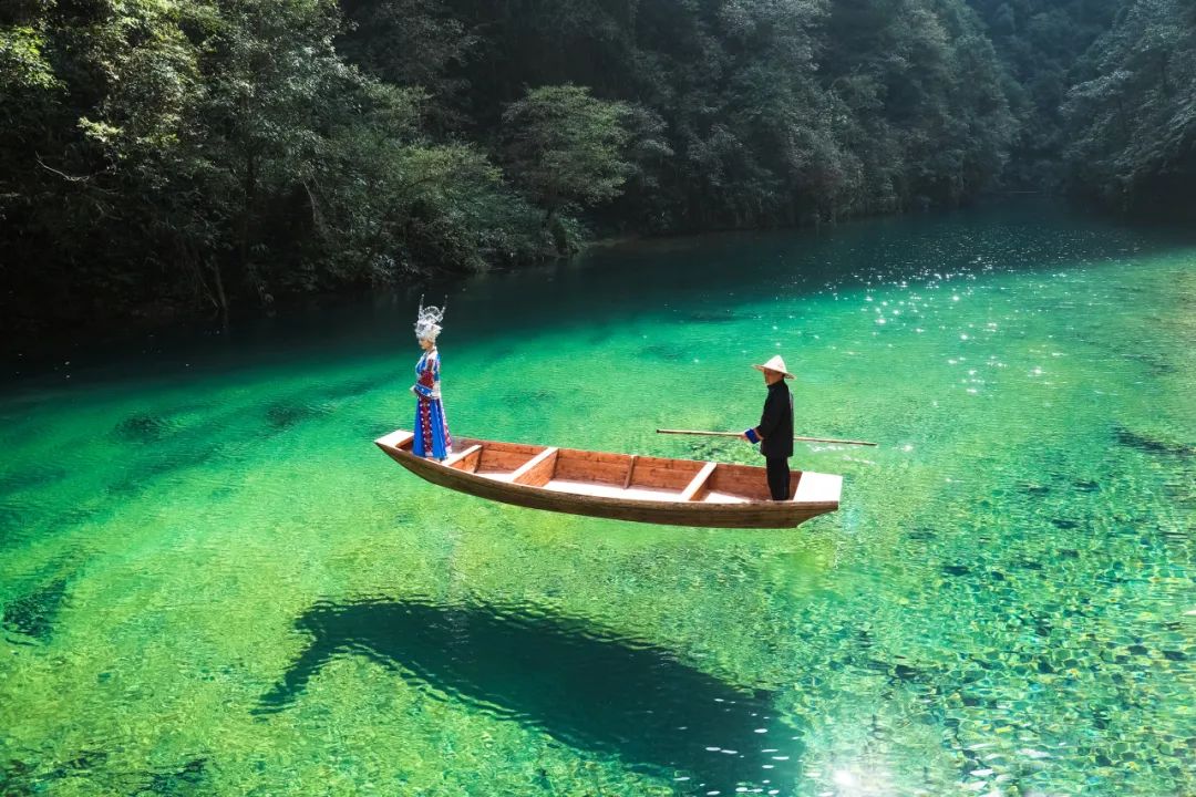 屏山地形奇特,整体呈狭长弧形地势,四周峭壁耸立,碧水穿梭其中,清澈见底,船行河面恰逢一束阳光从峡谷上方洒下,在河面形成暗色投影,船只犹如悬浮在半空中。逢此天工美景,你脑补的我们都想到了,端坐在木船之上倾国倾城不倾船。作为一个真正的戏精,请时刻保持镜头感,来给个V,我保证看不出来是摆拍