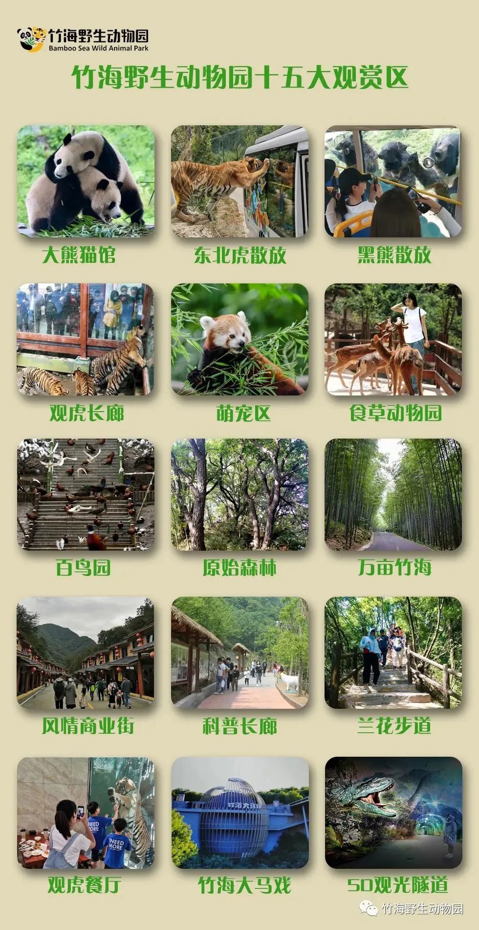 景区有熊猫馆、东北虎散放区、黑熊散放区、观虎长廊、萌宠区、食草动物园、百鸟园、原始森林、万亩竹海、风情商业街、观虎餐厅、科普长廊、兰花步道、竹海大马戏、5D观光隧道等十五大观光区域;