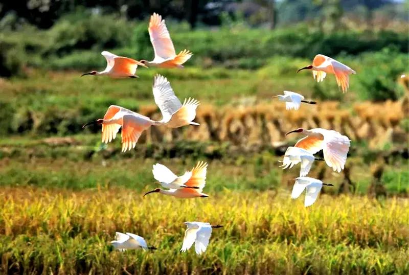 朱鹮与白鹭齐飞、青山共水天一色,朱鹮野化放飞基地拍摄国宝朱鹮