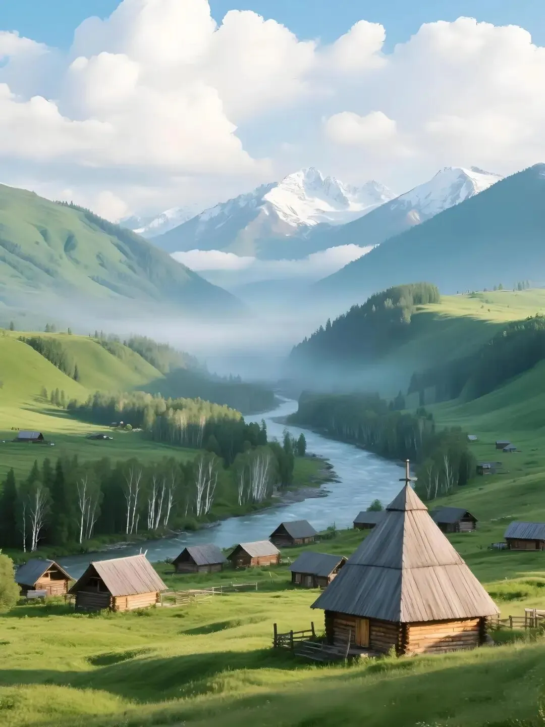 春日的禾木,积雪渐融,白桦林抽新芽,木屋错落在草原上,远处雪山巍峨,像极了《哈尔的移动城堡》里的童话小镇。3-4月游客稀少,能独享这份宁静,银河肉眼可见,星空下的木屋格外梦幻。
