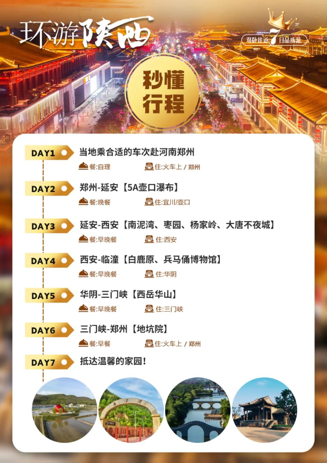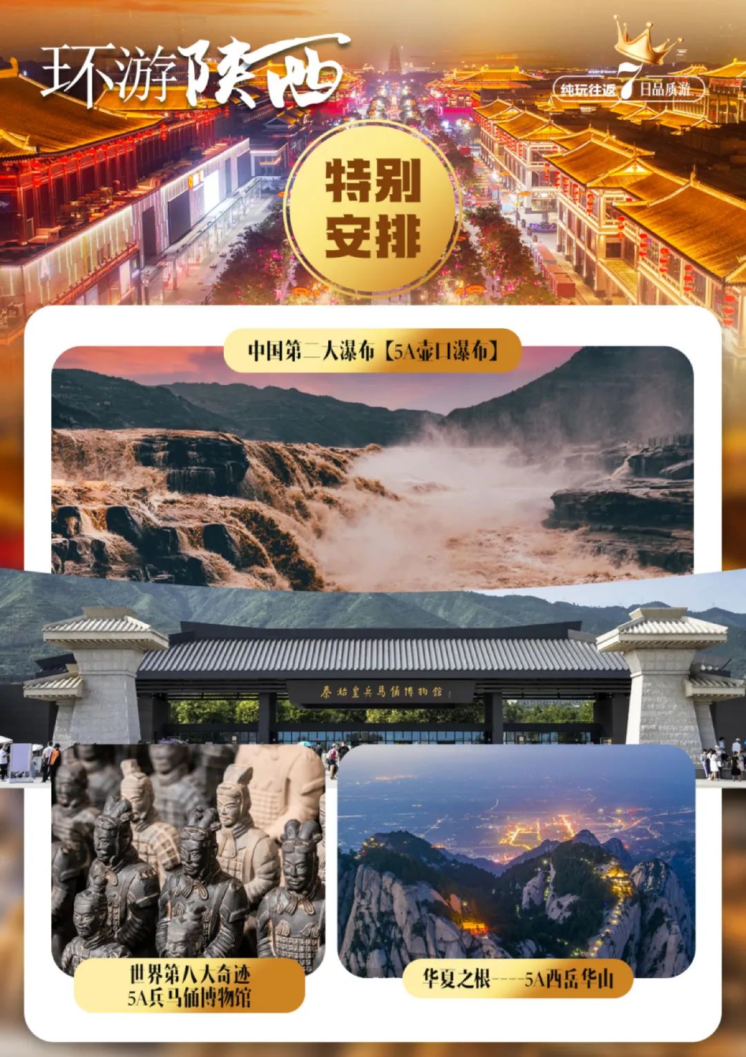 环游陕西古都西安壶口瀑布品质纯玩双卧/双高7天,古都西安、壶口瀑布、兵马俑、西岳华山、延安、南泥湾、宝塔山、王家坪、杨家岭、汉城湖、枣园革命旧址、白鹿原、大唐不夜城、钟鼓楼广场、回民街、三门峡、地坑院。
