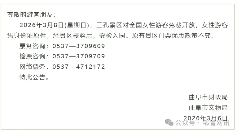 近日,文博曲阜公众号发布消息,2026年3月8日(星期日),三孔景区对全国女性游客免费开放。具体内容如下: