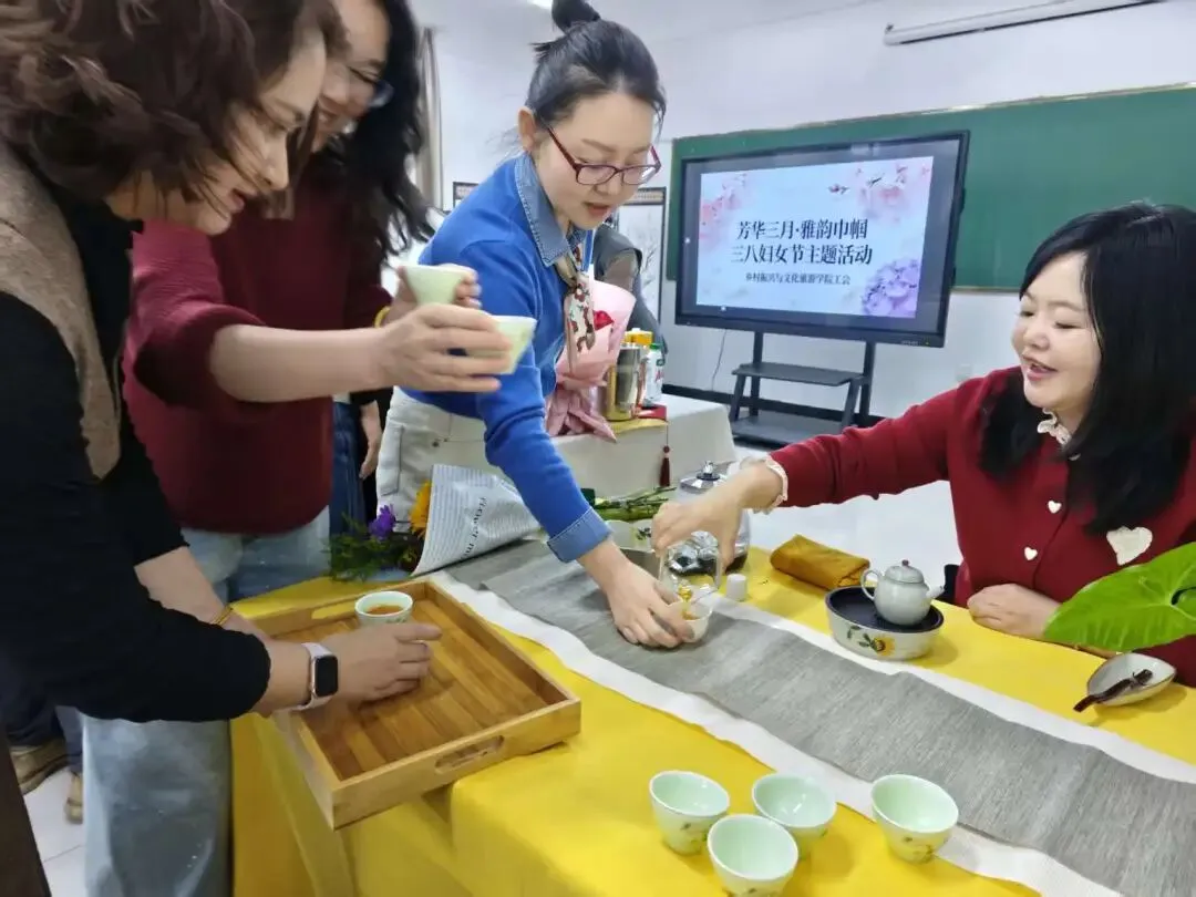 为庆祝三八国际妇女节,丰富女教职工文化生活,增强归属感与凝聚力,3月6日19:30学院工会在茶艺实训室开展“芳华三月·雅韵巾帼”主题活动,全院女教职工齐聚一堂、共庆佳节。