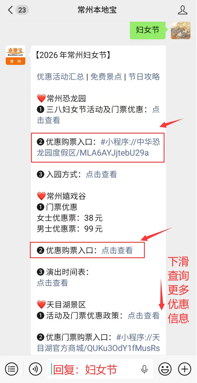 推荐查询:关注【常州本地宝】,点击发消息,在聊天对话框发送“东方”,即可获取2026常州东方盐湖城三八妇女节活动详情、优惠购票入口等信息。