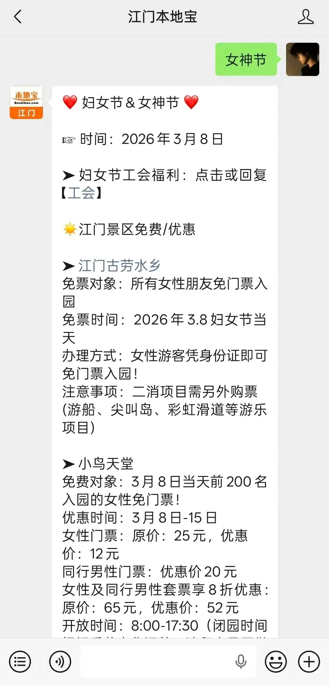 在微信聊天对话界面回复【女神节】