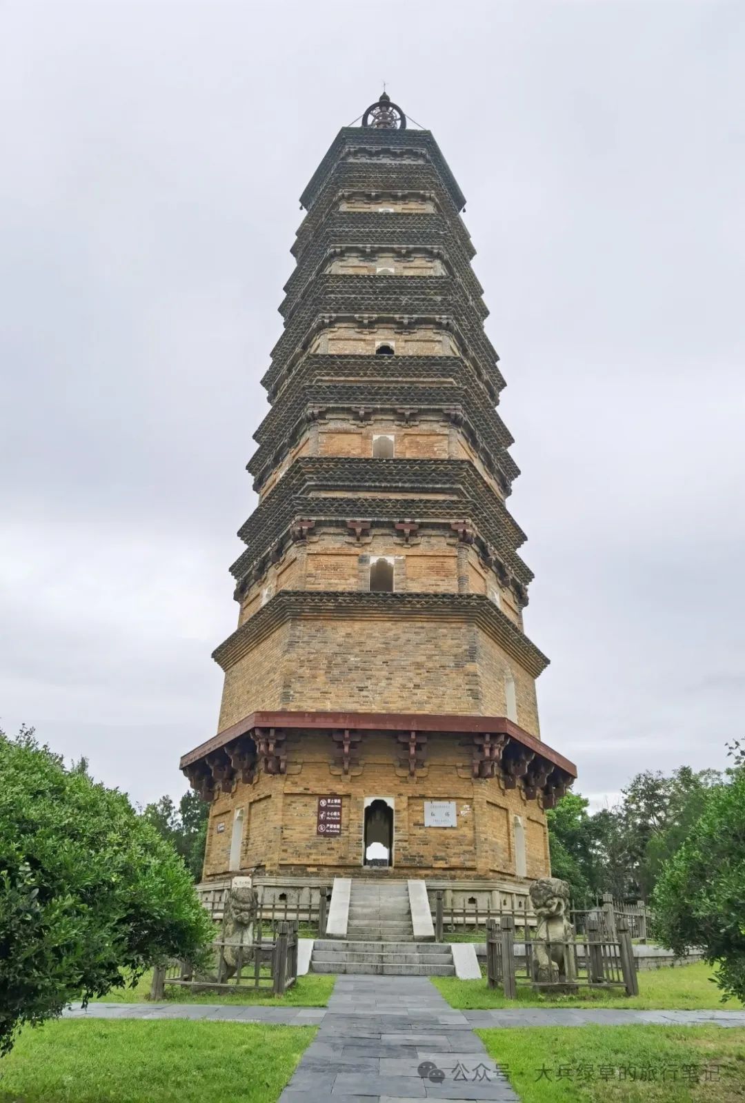 古塔高40.47米,由须弥座、七级六面塔身(塔内14层)和塔刹组成。塔身用大型青砖实砌,每层均用青砖叠砌出外挑平台,这是北宋初期佛塔的典型建筑造型。