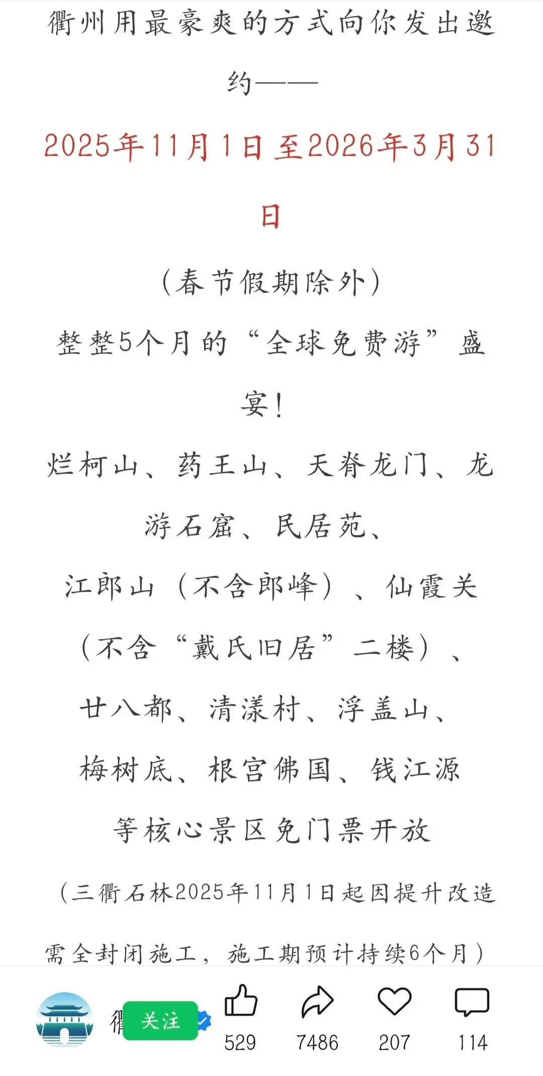 浙江-衢州到3.31众多景点免门票!