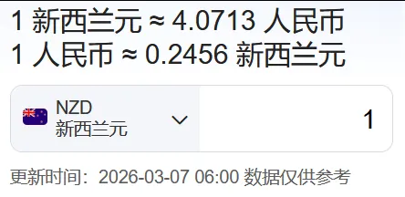 新西兰:1新西兰元≈4.0713人民币