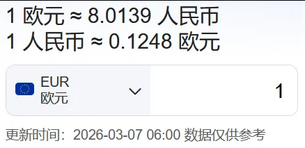欧洲:1欧元≈8.0139人民币