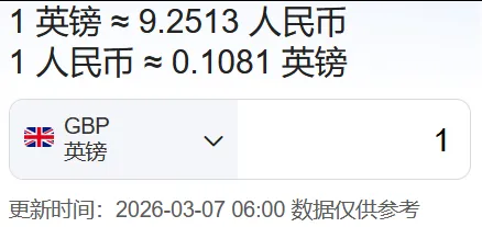 英国:1英镑≈9.2513人民币
