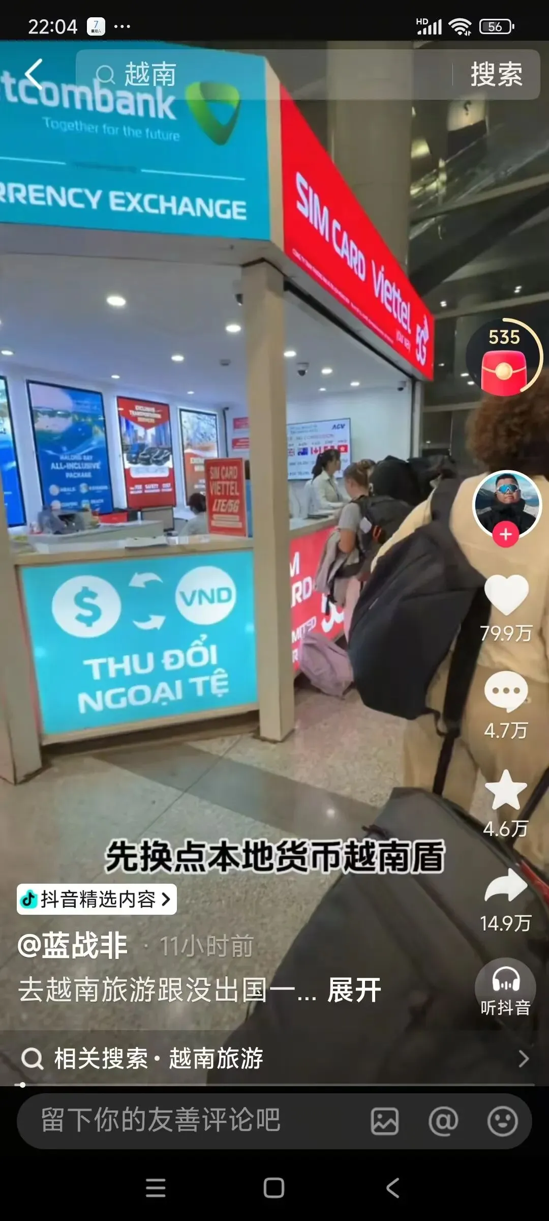 今天知名游戏主播“蓝某非”更新视频了,第一次知道他还得缘于:年前他在南非被绑架的事情,当时我们也发文提醒大家出国游注意安全。今天偶然刷到了他的视频,年后第一站去东南亚旅游,这次目的地越南先换点本地货币越南盾。